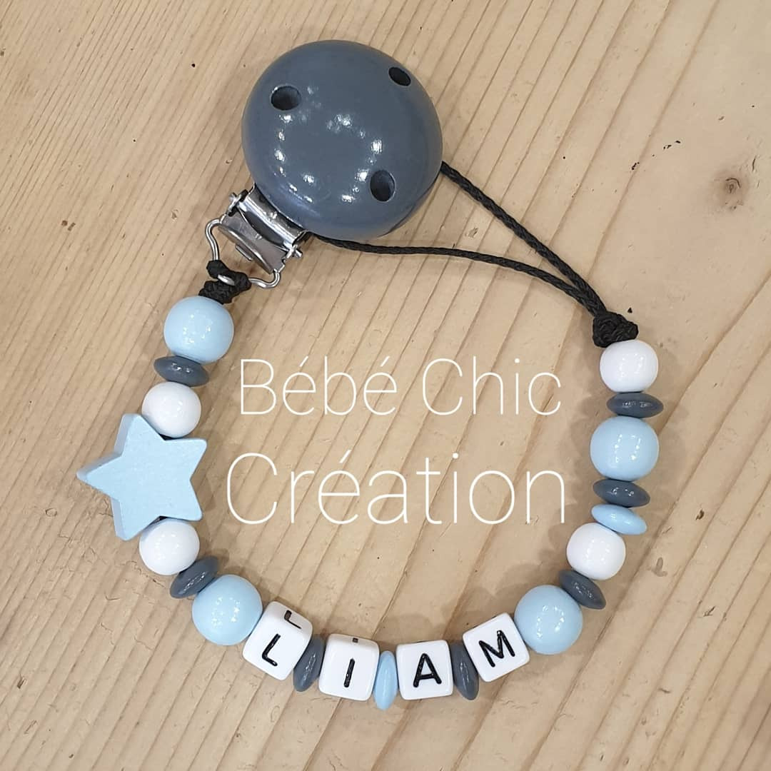 Attache sucette prénom personnalise Bleu ciel blanc et Anthracite