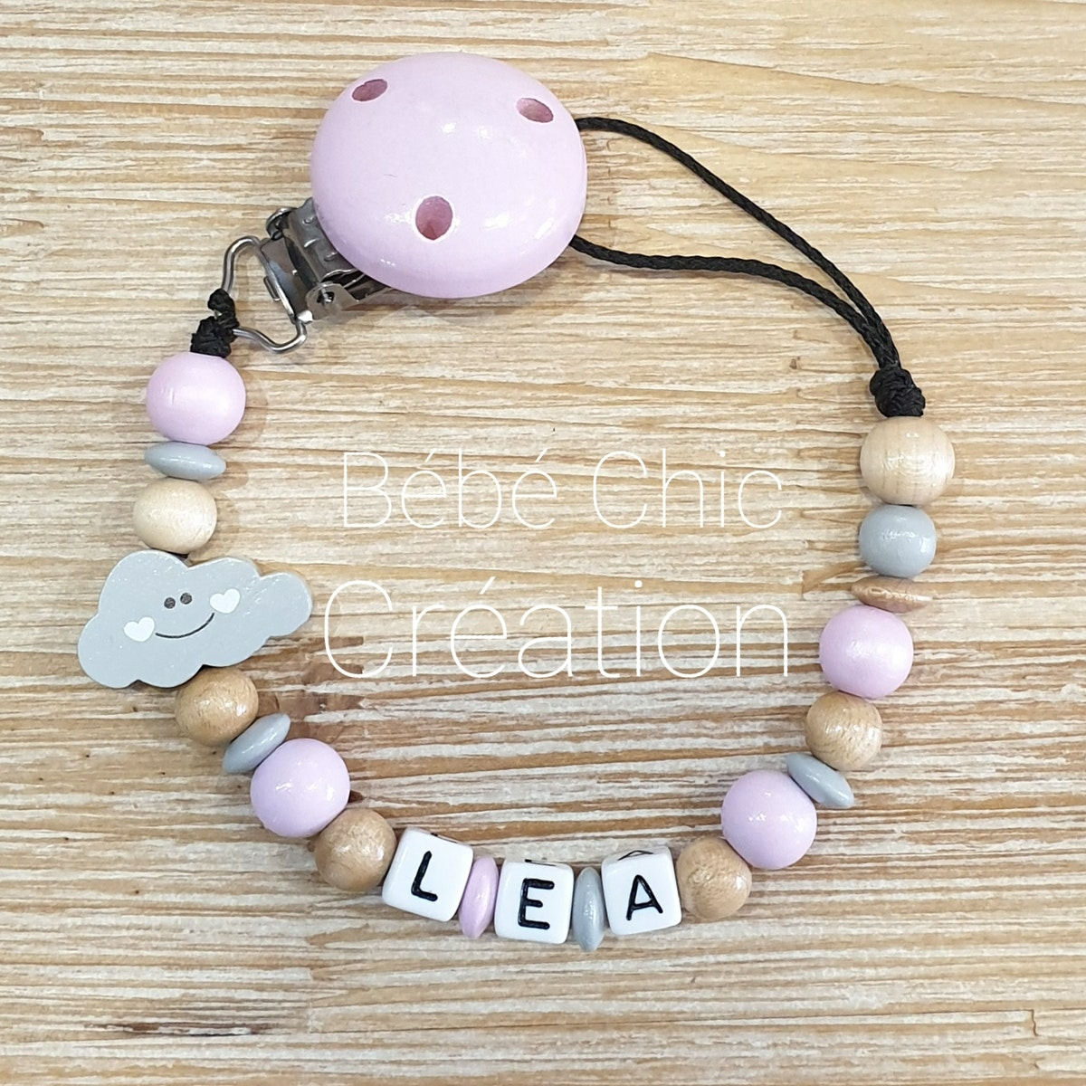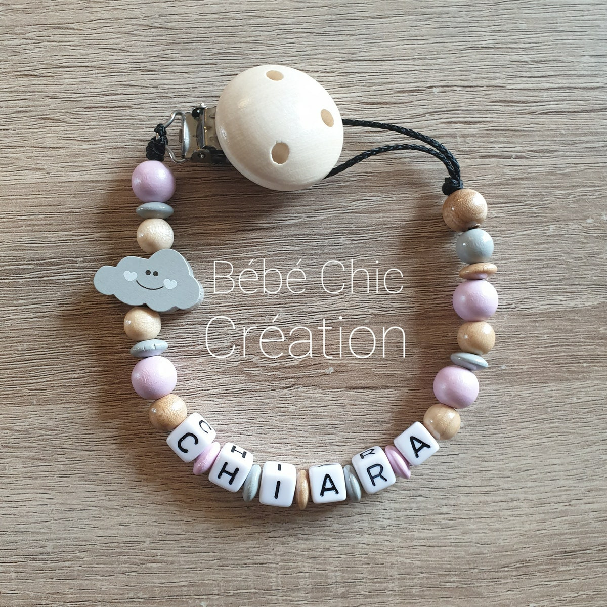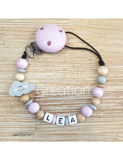 Attache sucette prénom personnalise Bois , rose pâle et gris