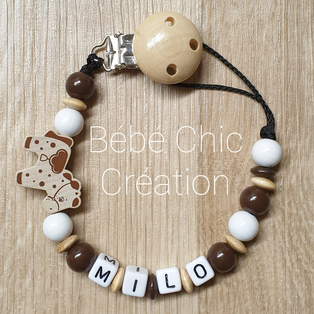 Attache sucette prénom personnalise, Cheval, jaune, Marron blanc et boic
