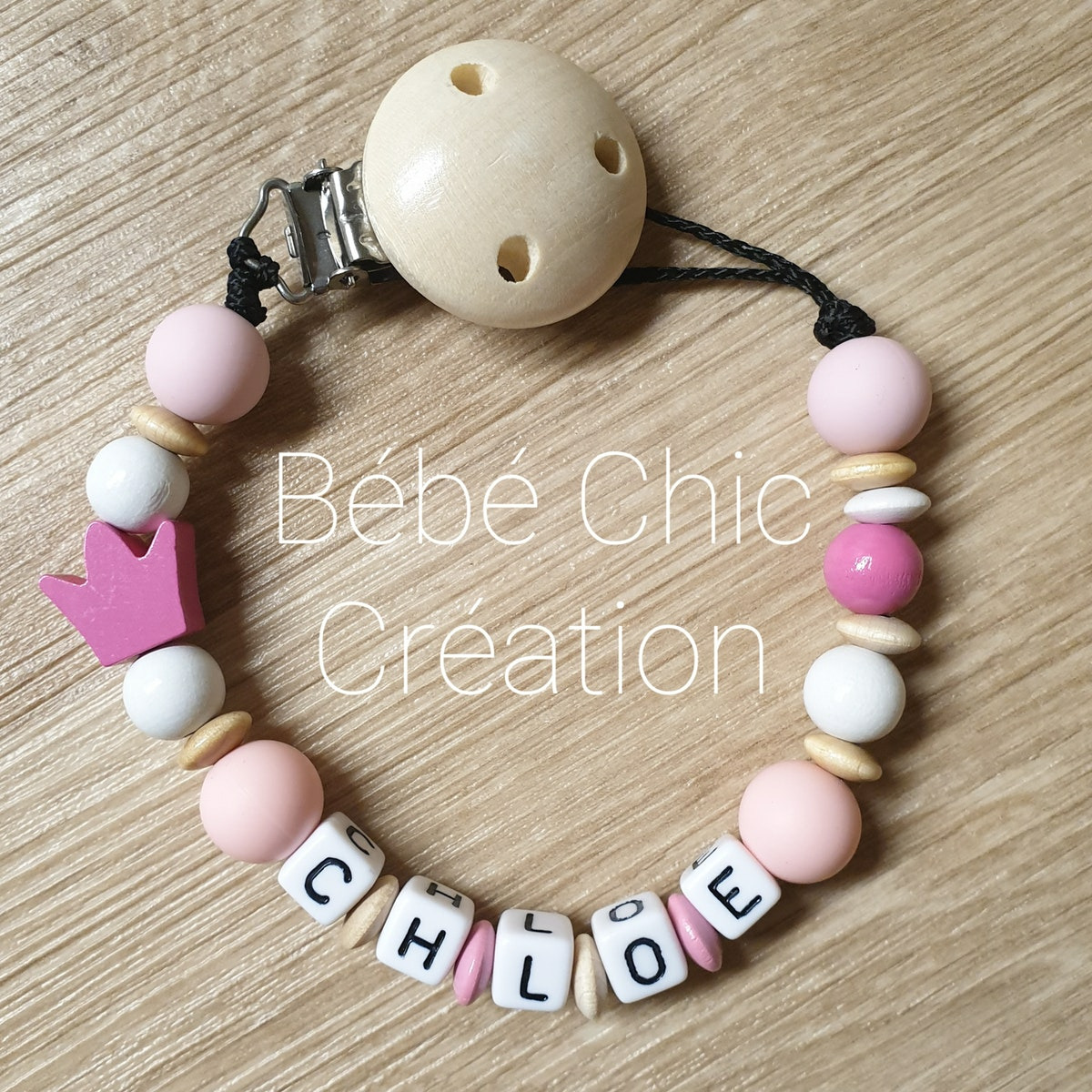 Attache sucette prénom personnalise en Silicone, rose, blanc et bois