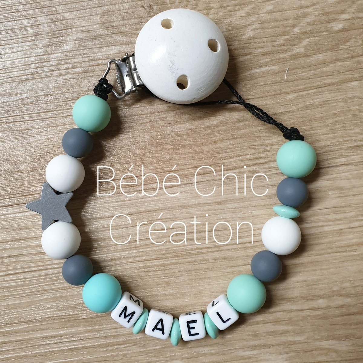 Attache sucette prénom personnalise en Silicone, vert d'eau, gris blanc