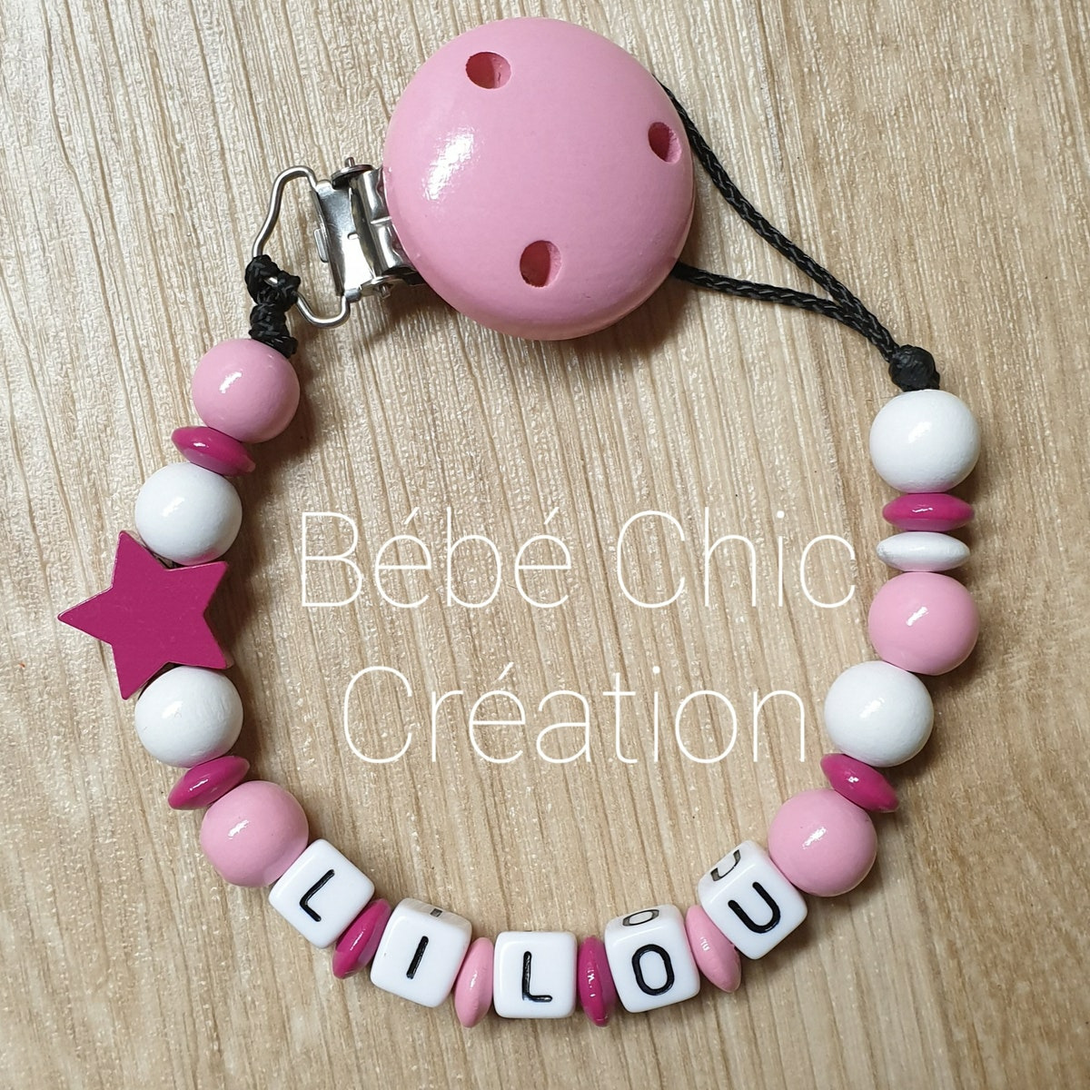 Attache sucette prénom personnalise, étoile Fuchsia, blanc et rose