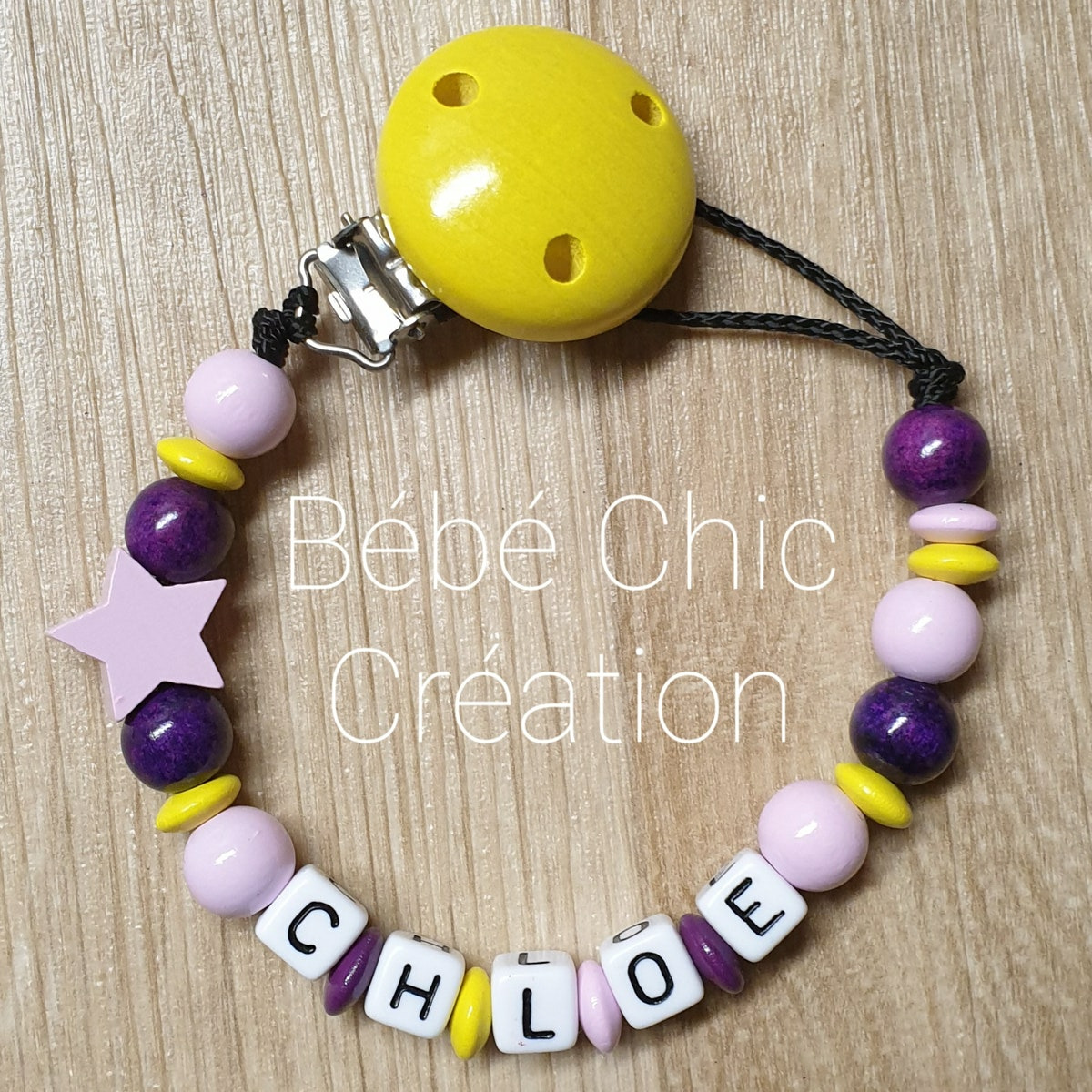 Attache sucette prénom personnalise, étoile, jaune, rose et violet