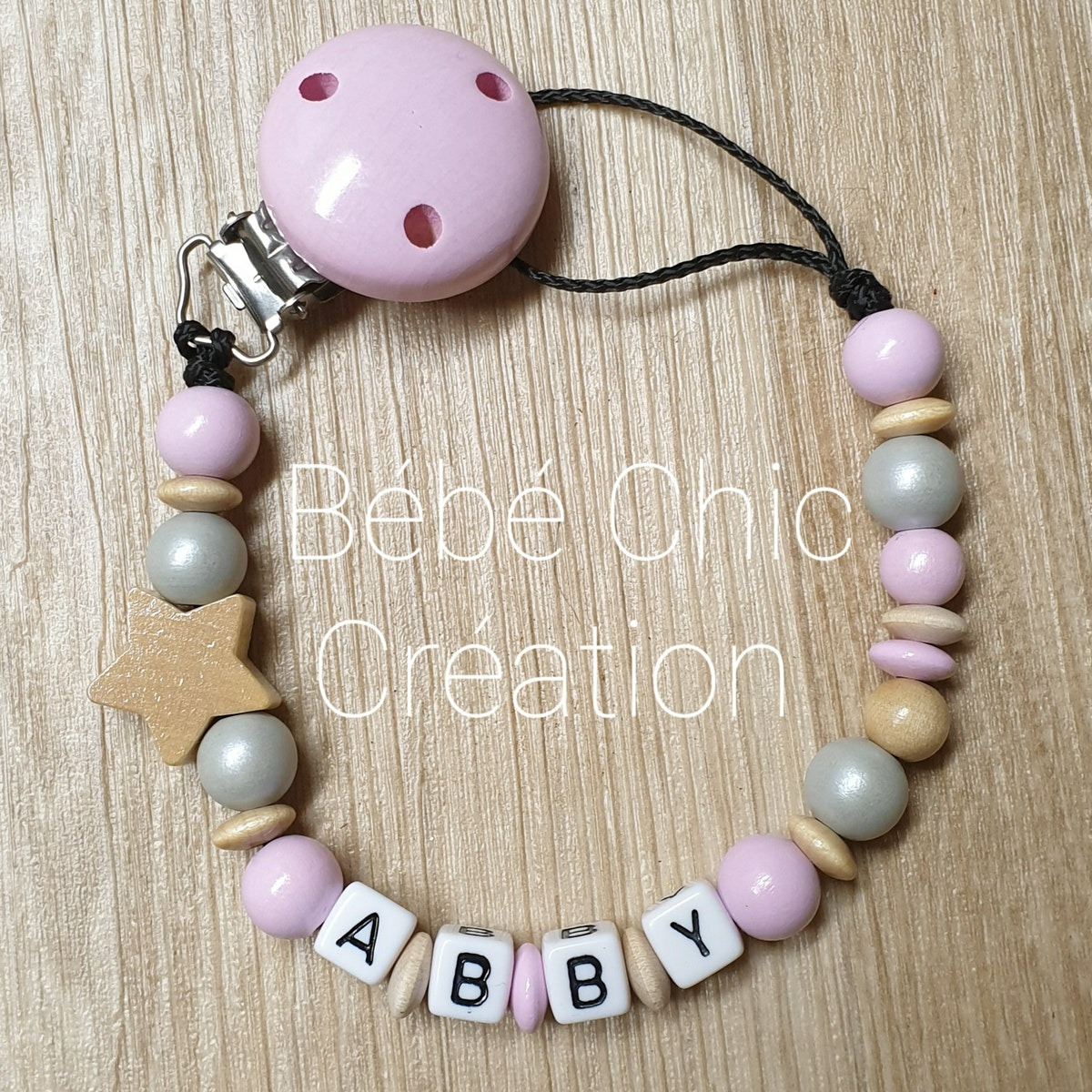Attache sucette prénom personnalise Rose pâle, gris et bois