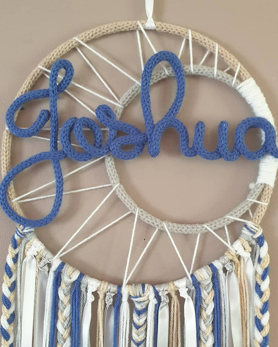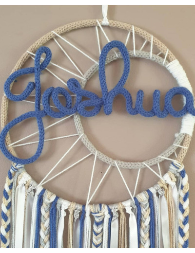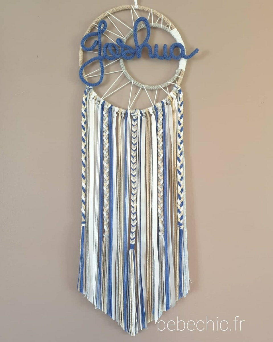 Attrape rêves personnalisé prénom, bleu, gris, lin et blanc