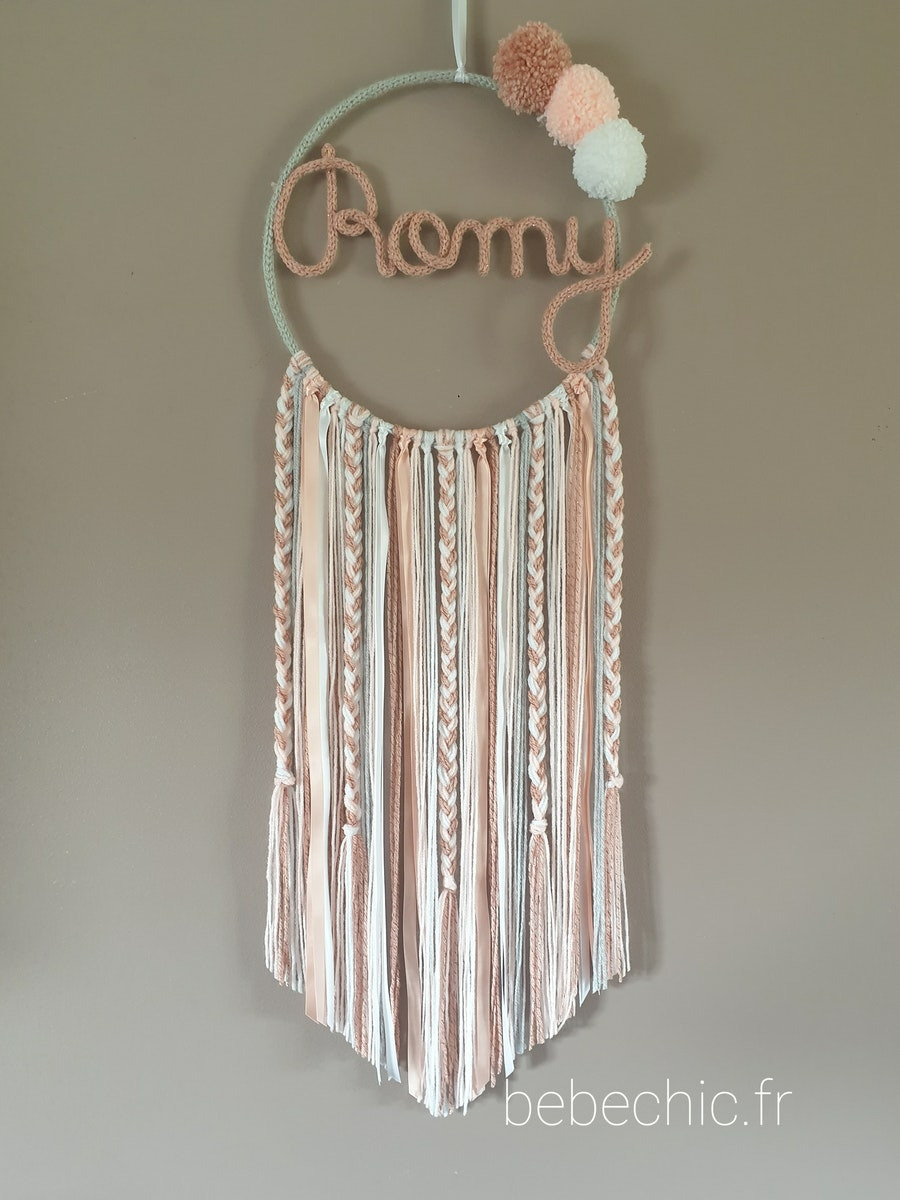Attrape rêves personnalisé prénom, vieux rose, rose poudre, blanc et gris