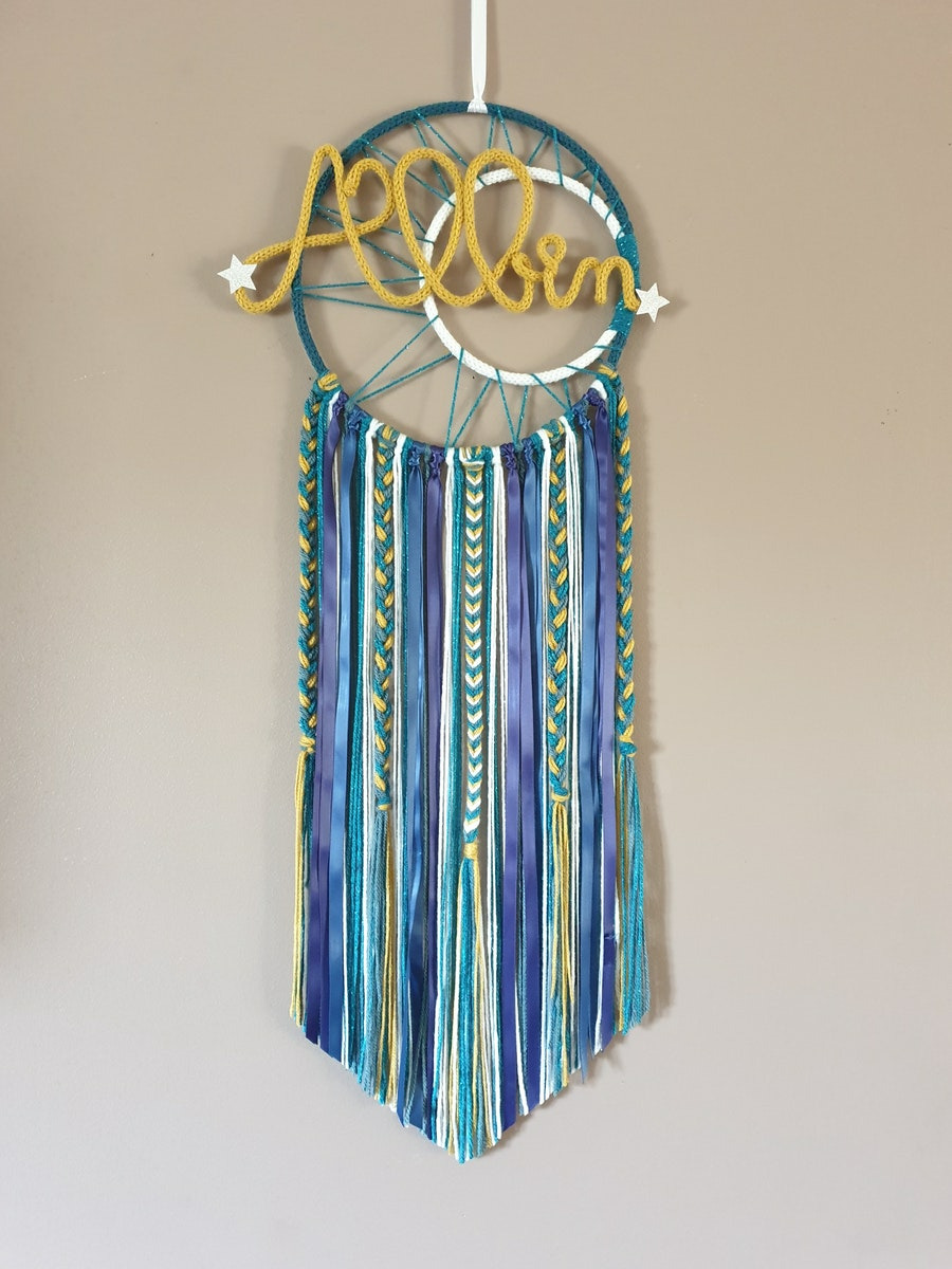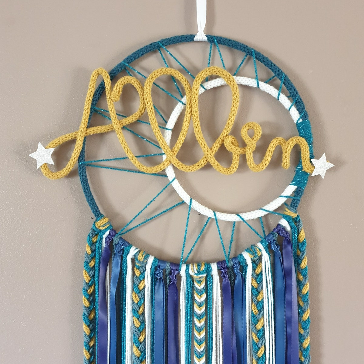Attrape Rêves Prénom Personnalisable, Moutarde, Bleu Pétrole, Blanc, Marine
