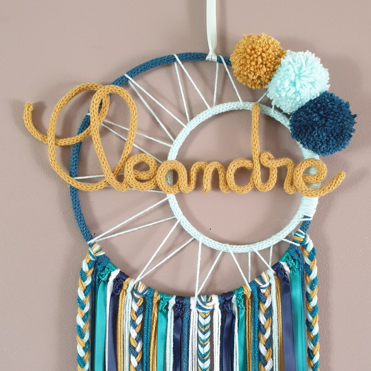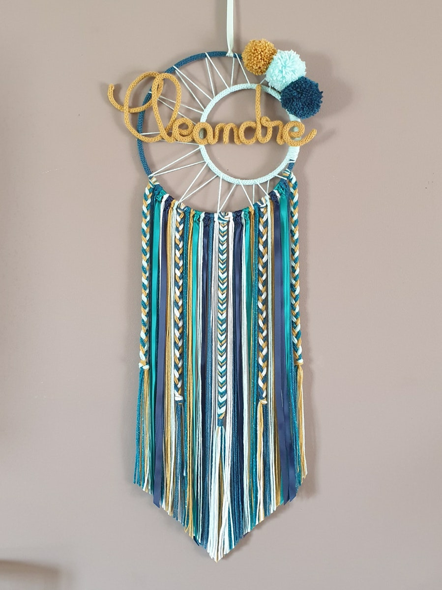 Attrape rêves prénom personnalisable, Moutarde, bleu, vert d'eau