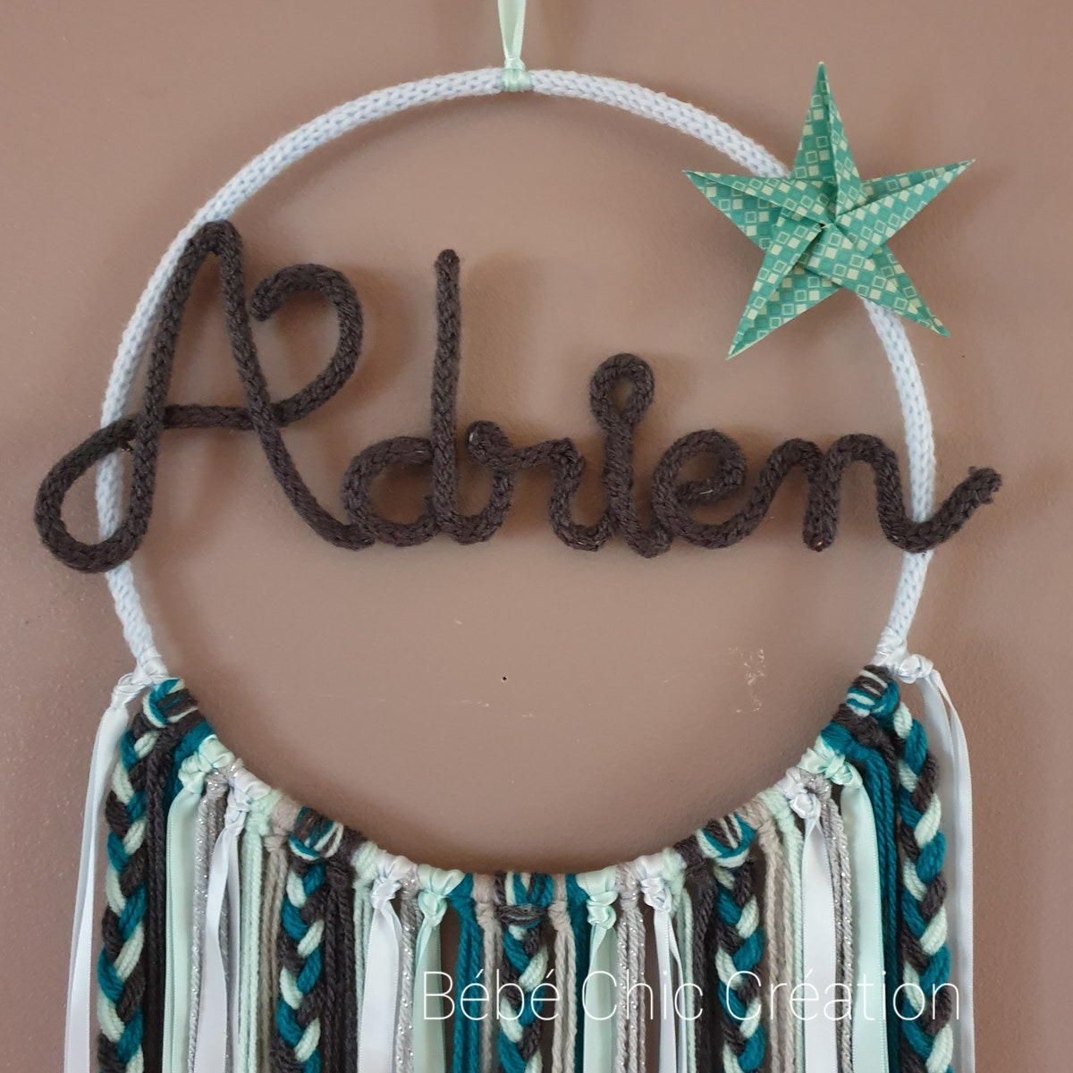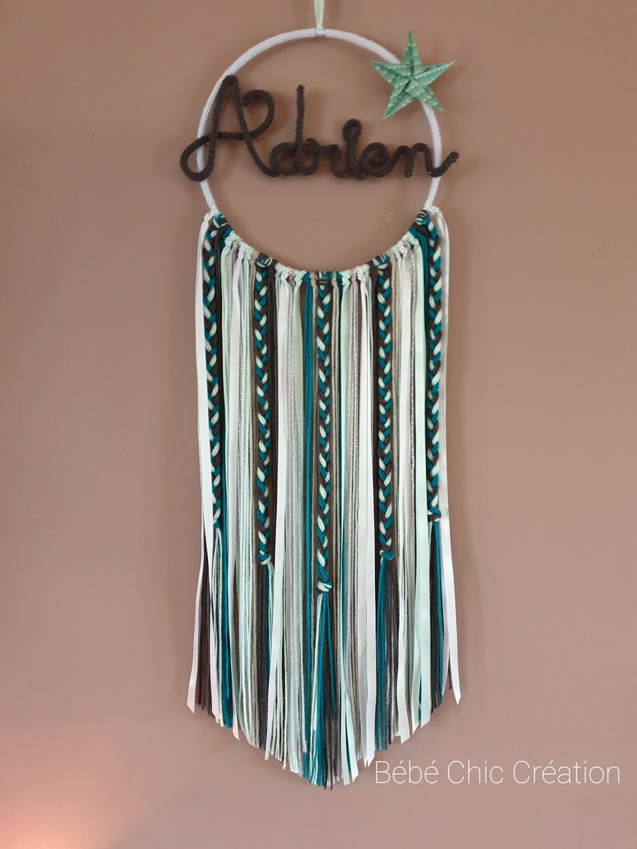 Attrape rêves prénom personnalisableVert canard, vert d'eau blanc et gris