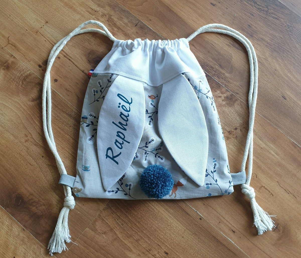 Voila un sac à dos tout mimi avec ses oreilles de lapin bi matière et son petit pompon assorti, il est idéal pour la créche, l'école, la nounou et même pour aller chez papi mamie . Ce petit sac lapinou sera le gardien idéal de doudou et tout plein de secrets ;)