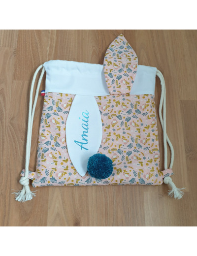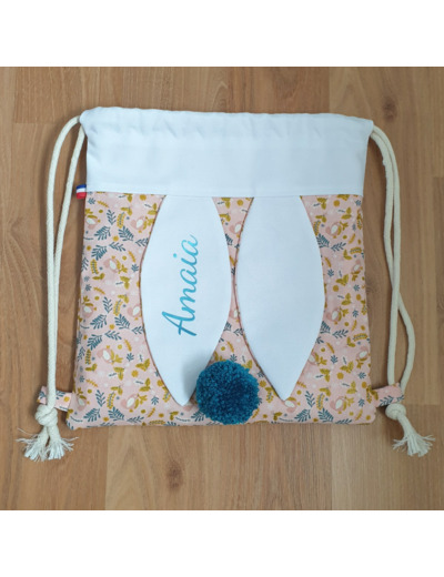 Voila un sac à dos tout mimi avec ses oreilles de lapin bi matière et son petit pompon assorti, il est idéal pour la créche, l'école, la nounou et même pour aller chez papi mamie . Ce petit sac lapinou sera le gardien idéal de doudou et tout plein de secrets ;)