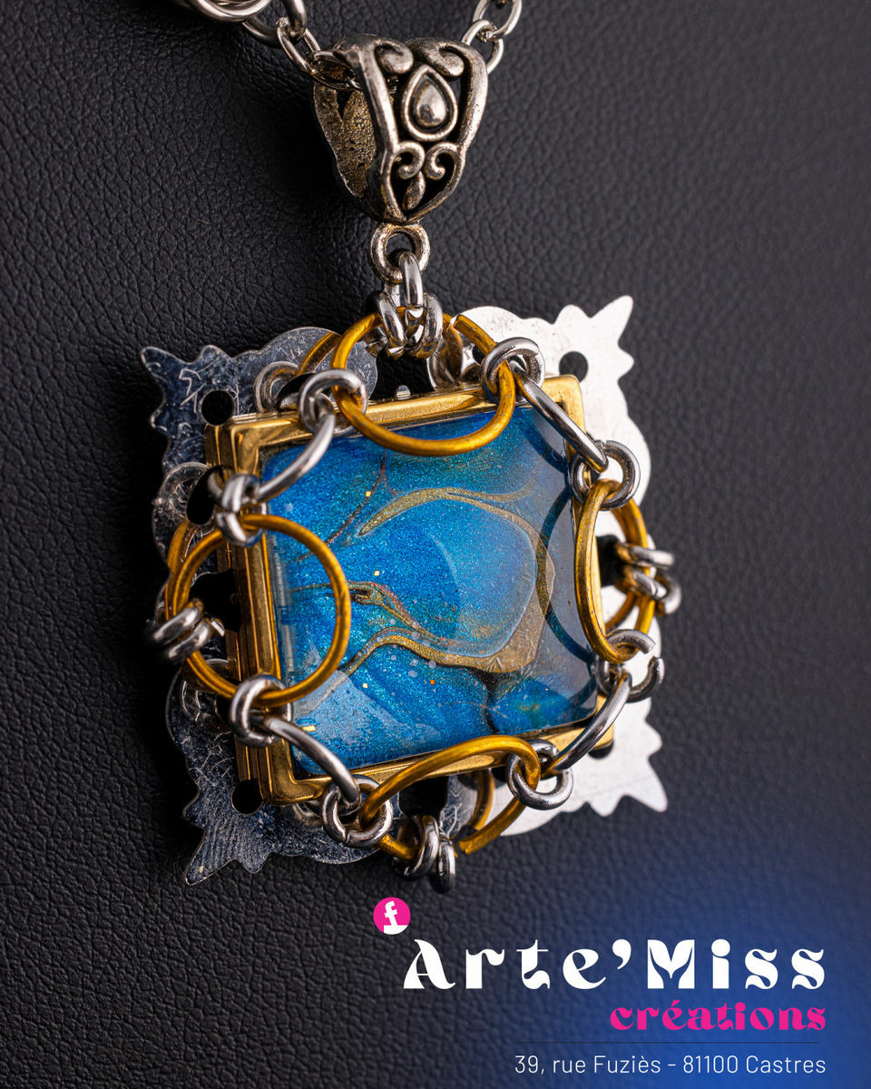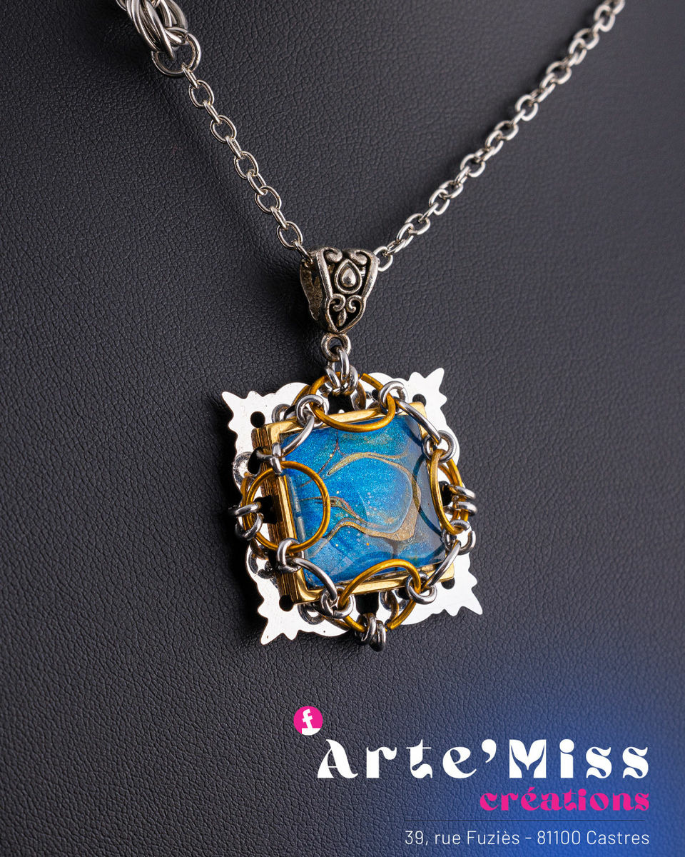 Collection "Celtic Spirit" Pendentif assemblé à la main sur plaque filigrane en acier inoxydable. Cabochon peint et recouvert d'un dôme en verre. Présenté sur une chaîne fantaisie sautoir, ornée de nœuds celtiques fait main.