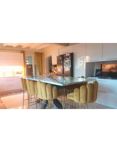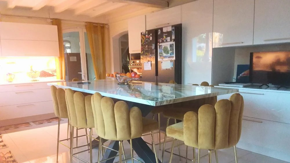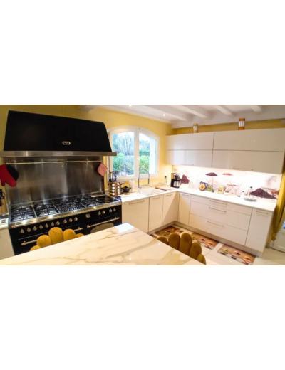 La maison principale, spacieuse et élégante, propose près de 250 m² habitables. Le rez-de-chaussée comprend une cuisine IXINA neuve de 30 m², entièrement équipée avec des matériaux haut de gamme (plan de travail en Dekton, piano de cuisson Lofra), un vaste séjour de 70 m² ouvert sur la terrasse et la piscine, trois chambres dont une actuellement aménagée en dressing, ainsi qu’une salle de bain avec douche hydromassante et baignoire.