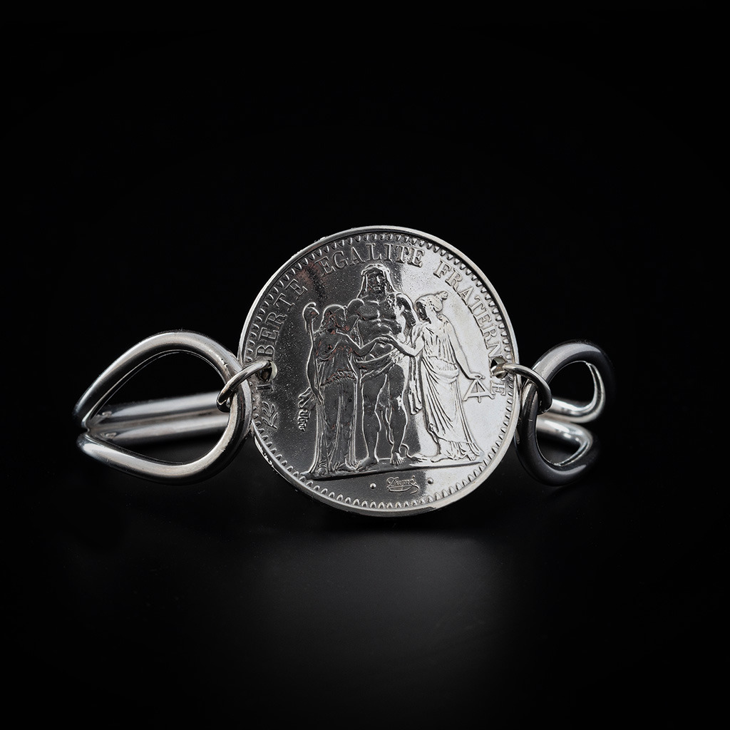 Argent massif 925/1000ème. Fil 3 mm, pièce 10 F cintrée, fermoir anneau marin.