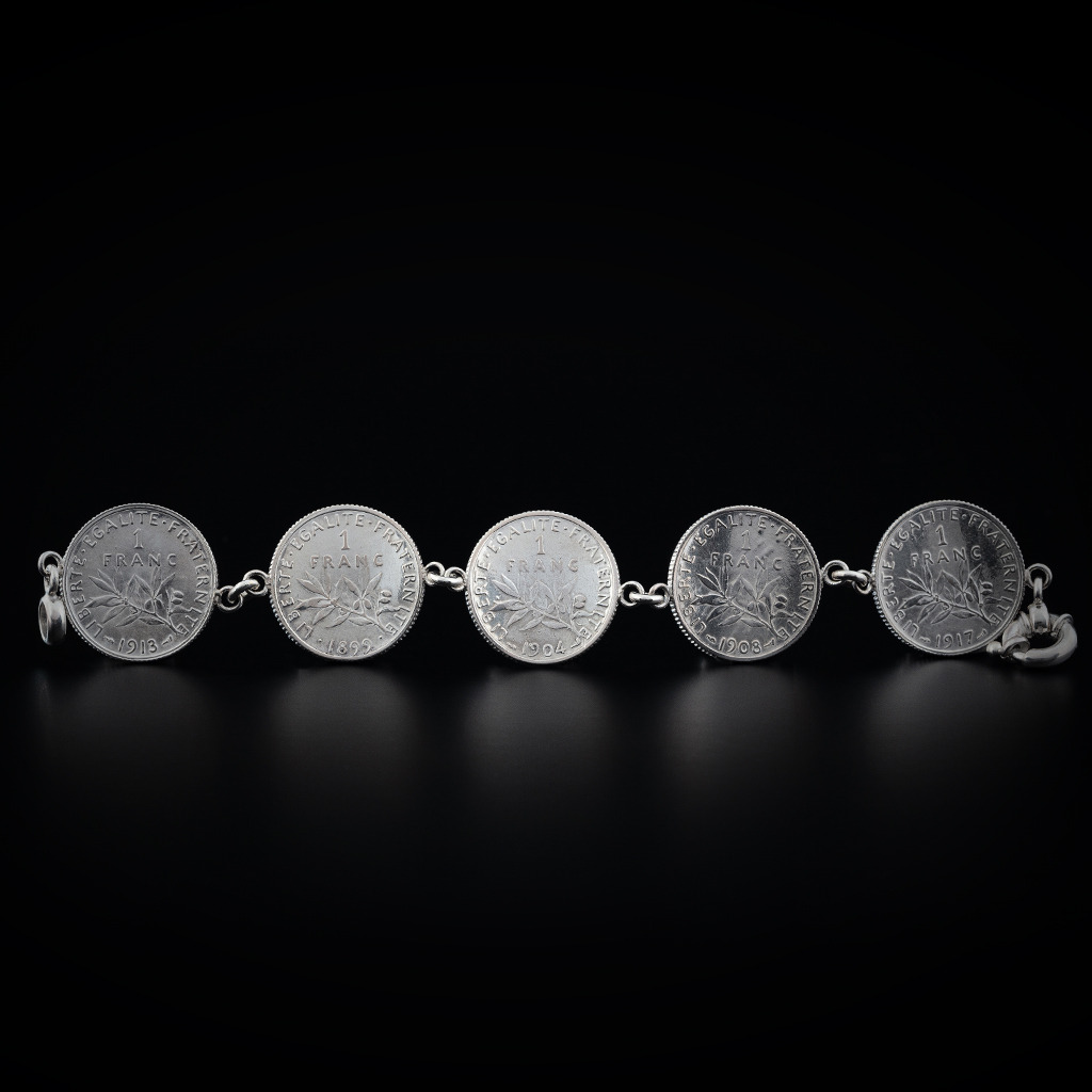 Argent massif 925/1000ème. 5 pièces de 1 F cintrées. Fermoir anneau marin.