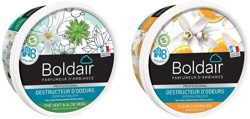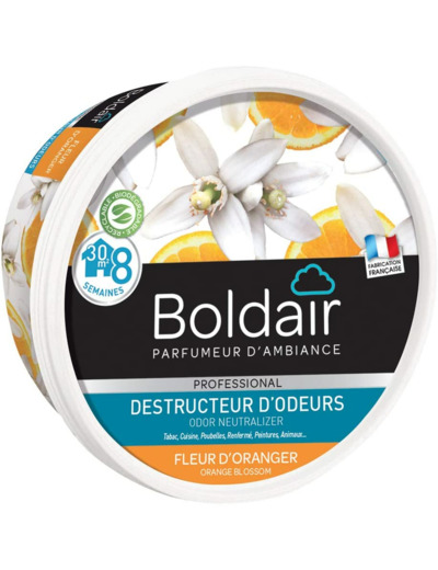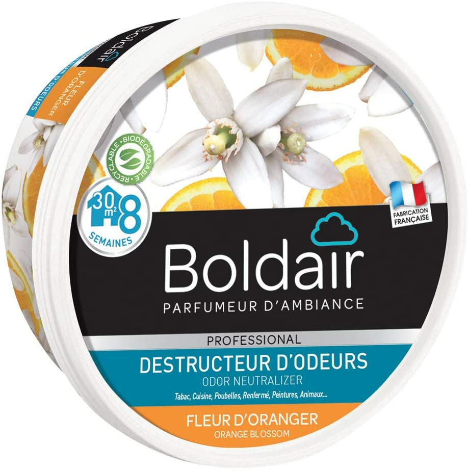 Boldair gel destructeur d’odeurs est un destructeur d’odeurs permanent sous forme de gel solide. Il ne masque pas les mauvaises odeurs mais les détruit radicalement. Fonctionne par évaporation de ses agents actifs naturels : ils entrent en contact avec les molécules malodorantes en suspension dans l’air et les détruisent. Grâce à sa grille de diffusion, le gel s’évapore de façon régulière ayant ainsi une efficacité permanente et durable (jusqu’à 8 semaines). Il est efficace sur toutes les mauvaises odeurs : tabac, cuisine, poubelles, toilettes, moisissures, renfermé, animaux, peinture… Non toxique et biodégradable, il ne dégage pas de gaz. S’utilise partout ou les odeurs persistent : maison, voiture, bureau, vestiaires, collectivités… Diffuse un agréable parfum : 6 parfums tendance disponibles afin de créer une atmosphère agréable. Fleur d’oranger : note fleurie calme et relaxante.
