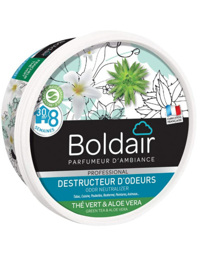 Boldair gel destructeur d’odeurs est un destructeur d’odeurs permanent sous forme de gel solide. Il ne masque pas les mauvaises odeurs mais les détruit radicalement. Fonctionne par évaporation de ses agents actifs naturels : ils entrent en contact avec les molécules malodorantes en suspension dans l’air et les détruisent. Grâce à sa grille de diffusion, le gel s’évapore de façon régulière ayant ainsi une efficacité permanente et durable (jusqu’à 8 semaines). Il est efficace sur toutes les mauvaises odeurs : tabac, cuisine, poubelles, toilettes, moisissures, renfermé, animaux, peinture… Non toxique et biodégradable, il ne dégage pas de gaz. S’utilise partout ou les odeurs persistent : maison, voiture, bureau, vestiaires, collectivités… Diffuse un agréable parfum : 6 parfums tendance disponibles afin de créer une atmosphère agréable. Thé vert & Aloe Vera : note vivifiante.