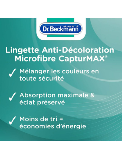 Quantité:1La nouvelle Lingette Anti-Décoloration Microfibre CapturMAX® Dr. Beckmann offre une double technologie pour une action complète : La structure microfibre unique capture rapidement les couleurs qui dégorgent. Les molécules ultra absorbantes CapturMAX® contenues dans la lingette, se libèrent dans l’eau de lavage et encapsulent les particules de couleur restantes, et évitent ainsi qu’elles ne se déposent sur le linge. Grâce à Dr. Beckmann, vos couleurs restent éclatantes et votre look intact ! Idéal pour Tous vos vêtements multicolores avec des motifs, des rayures ou tout autres éléments contenant différentes couleurs Toutes températures