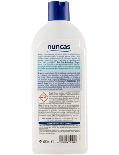Crème nettoyante multi-surfaces pour salles de bains. Les surfaces de notre maison, qui se distinguent toujours plus par l'usage de matériaux précieux et recherchés, ont besoin d'un nettoyant spécifique Pour leur hygiène et leur soin. Un produit étudié pour éliminer les dépôts de saleté et de calcaire de toutes les surfaces lisses et poreuses qui garantissent un nettoyage en profondeur tout en respectant les matériaux les plus délicats utilisés dans la salle de bains et dans tous les environnements de notre maison. Mode d'emploi: utiliser brax pur, vaporiser une petite quantité sur une éponge ou un chiffon humide. Une fois la surface nettoyer, rincer avec soin et Sécher avec un chiffon propre. Ne pas utiliser sur bois naturel ou sur des surface laquées.