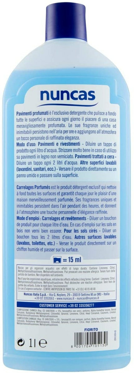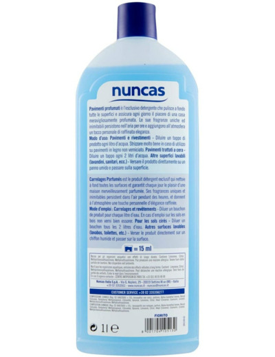 Nettoyant universel – Tous types de sols il n’est pas toujours vrai que les surfaces dégraissées ne dégagent pas d’odeur (mais qu’elles sentent l’ammoniaque). vous n’avez jamais remarqué comme il est agréable quand on Rentre chez soi de sentir le parfum des sols tout juste nettoyés? C’est une grande satisfaction pour la maîtresse de maison qui offre une note de bien-être à la famille et aux amis qui passent le pas de la porte. Et cela peut être très simple quand on utilise un produit spécialement conçu pour laver et parfumer d’un seul geste. Idéal pour le nettoyage quotidien, pour avoir chaque jour des sols non seulement propres mais aussi frais et parfumés. Pavimenti profumati s’utilise dilué dans l’eau pour le nettoyage quotidien de tous les sols cirés ou non. Un seul passage suffit pour avoir une propreté impeccable. Ne nécessite pas de rinçage. Utilisé pur sur une éponge, il est parfait pour les lavabos, les revêtements et les sanitaires.