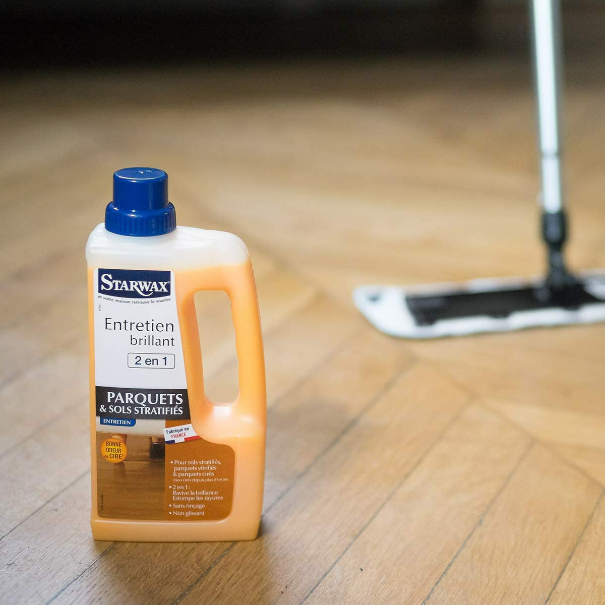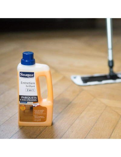 Grâce à sa formule 2 en 1, l'Entretien brillant Starwax nettoie et ravive la brillance de vos parquets et sols stratifiés en une seule opération. Non glissant et sans rinçage, il permet d'entretenir régulièrement et de préserver la beauté des parquets vitrifiés ou cirés (non cirés depuis plus d'un an) et des sols stratifiés (sauf contre-indication du fabricant). Un litre d'Entretien brillant Starwax vous permet 12 entretiens de 60m² soit jusqu'à 750m².