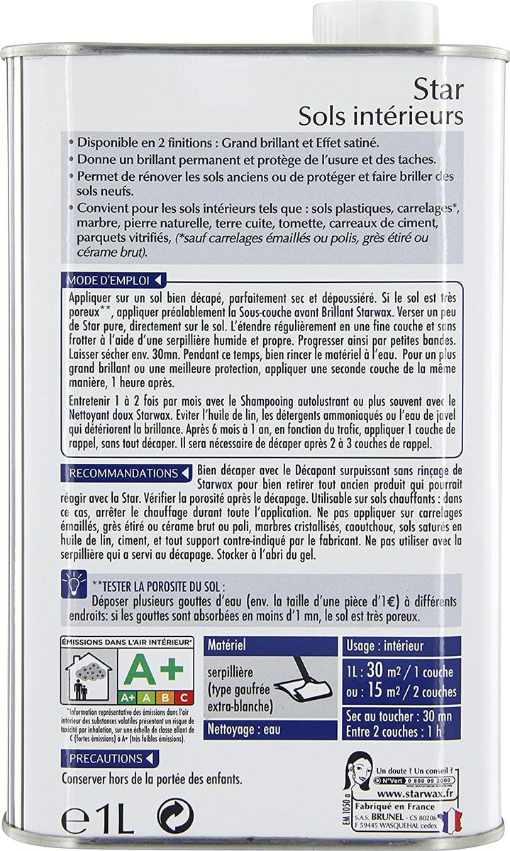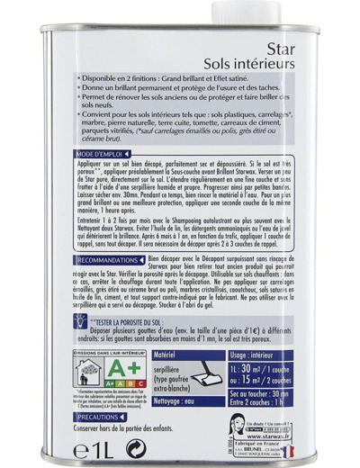 Le Rénovateur brillant Star pour sols intérieurs protège de l’usure et des taches et redonne à votre sol un beau brillant permanent, jusqu’à 1 an ! Il est adapté pour tous carrelages (sauf carrelages émaillés ou polis, grès étiré ou cérame brut), marbre, pierres naturelles, terres cuites, tomettes, carreaux de ciment, sols PVC, parquets vitrifiés, sols stratifiés. Il permet de rénover les sols anciens ou de protéger et faire briller des sols neufs.