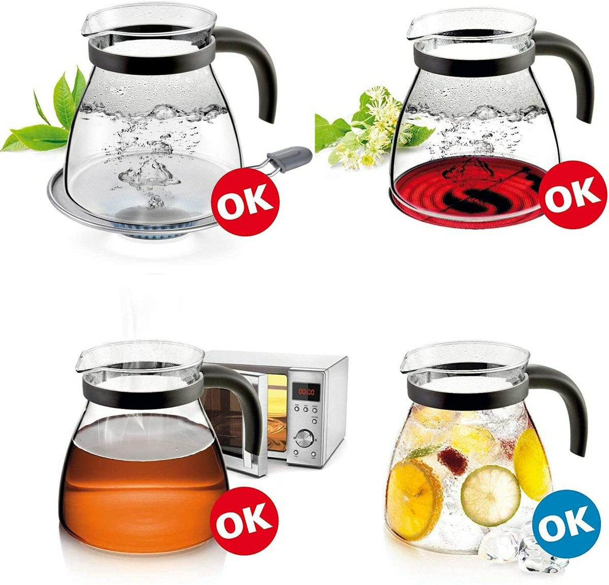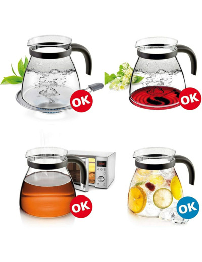 Bouilloire-théière avec large passe-thé pour infuser le thé, les herbes aromatiques, les fruits et pour préparer la tisane de cynorhodons, d’orties, de sureau noir, de gingembre, etc. Fabriquée en verre borosilicate et en plastique résistants à la chaleur. Convient aux cuisinières à gaz, électriques et vitrocéramique et au four à micro-ondes. 3 ans de garantie.