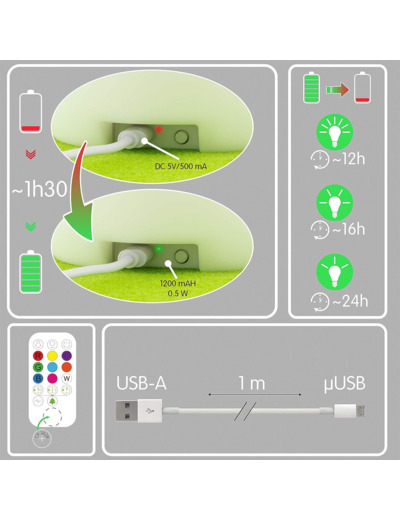 Le corps de la veilleuse est en silicone haute qualité, non toxique, garantie sans phtalate et lavable. cette partie supérieure est détachable du socle: le boîtier lumineux. celui-ci est en plastique de type abs aux normes tout age. les variations lumineuses se font suivant 3 modes et 8 couleurs différentes. les changements de modes se font soit en "tapotant" la veilleuse, soit en utilisant la télécommande fournie. la veilleuse fonctionne sur batterie. celle-ci se recharge grace au cable usb (fourni) en se connectant sur un appareil usb ou sur un chargeur d'alimentation universelle (type chargeur de téléphone mobile). la télécommande (pile cr2026 incluse) permet d'accéder à des fonctions supplémentaires (voir notice).