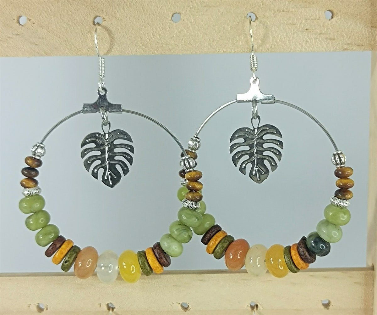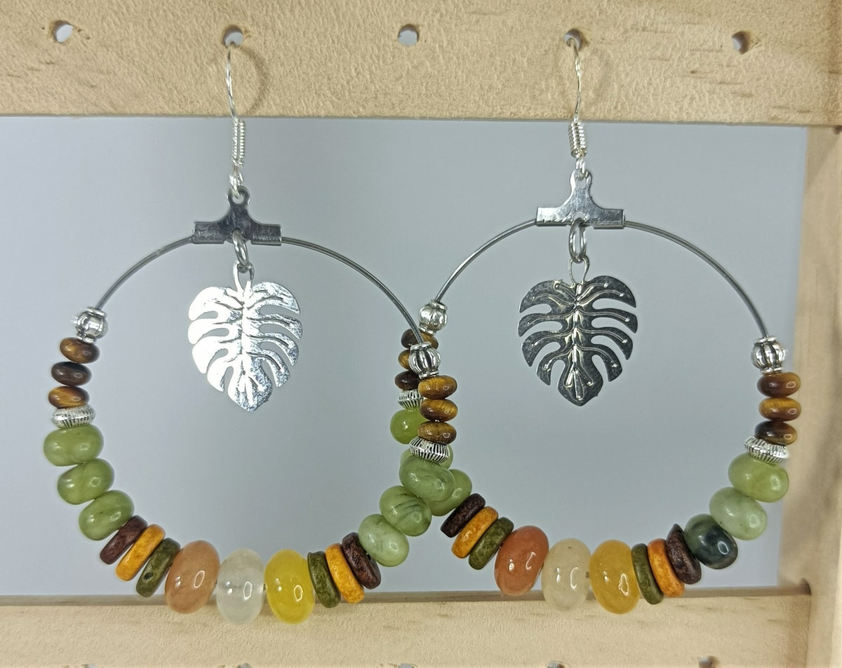 B.O. ambre/serpentine/œil de tigre/argenté feuille de palmier Ø 4cm