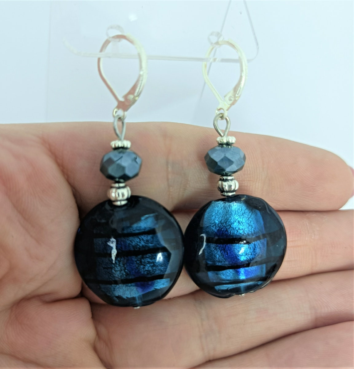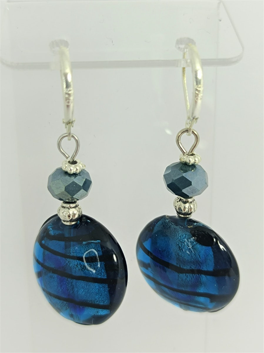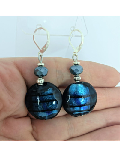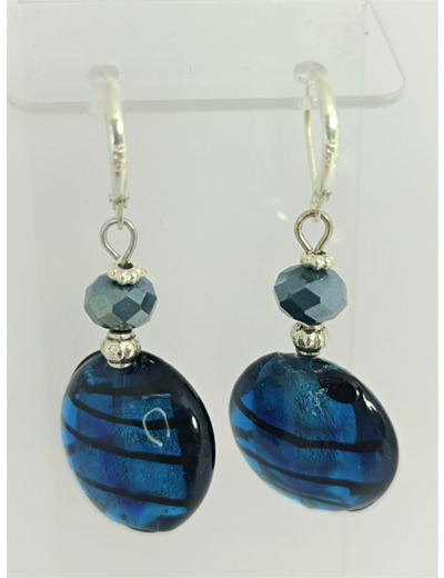 Boucles d'oreilles bleu/argenté perles en verre de Murano, métal argenté et perles de verre faceté.