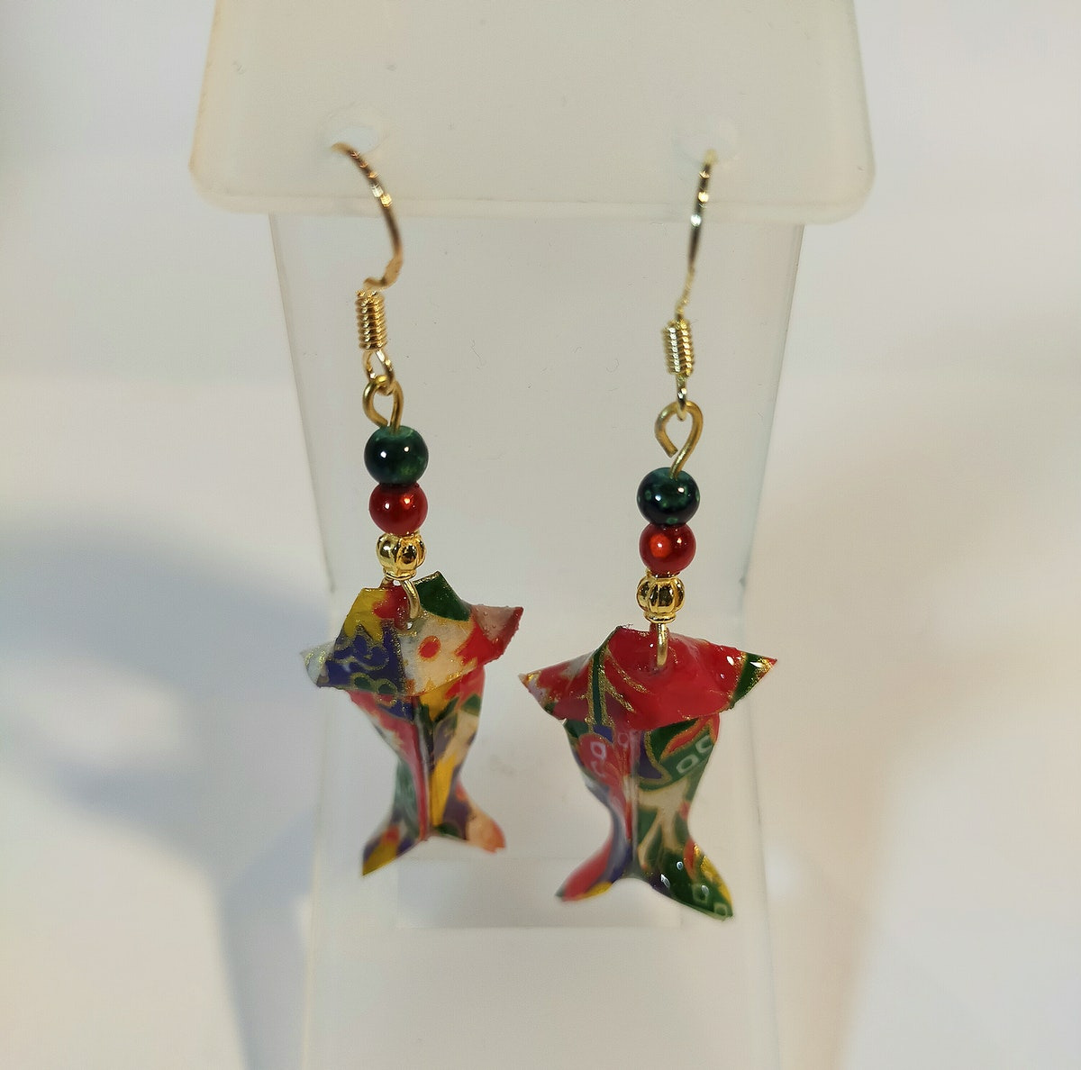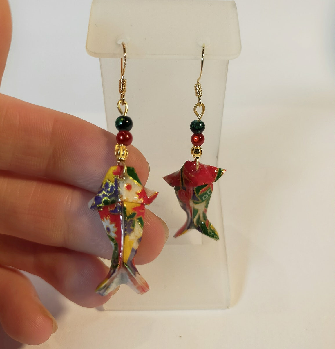 Boucles d'oreilles réalisées en origami, uniques, pliée avec amour! + résine. Très joli papier chiyogami dans des tons estampé de motifs traditionnels japonais.