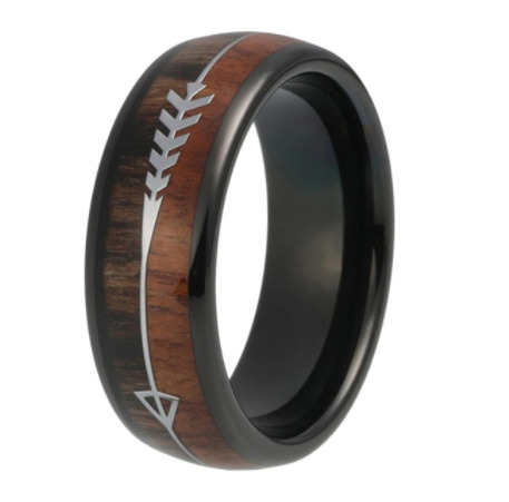 Bague en forme de flèche, incrustation en bois naturel sur acier inox noir