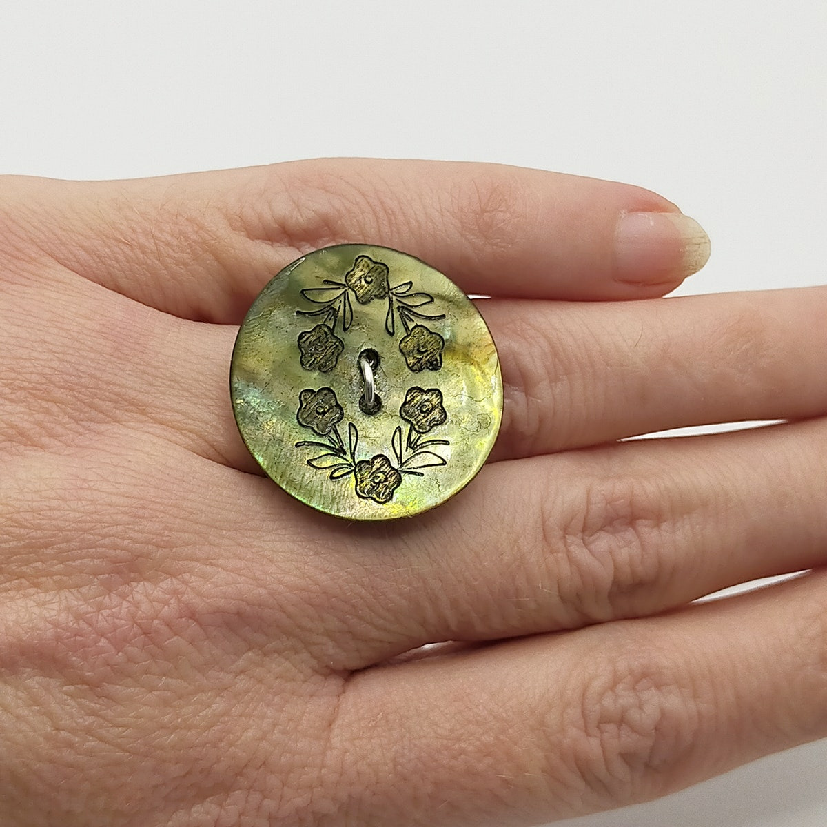 Bouton de nacre gravé monté en bague.