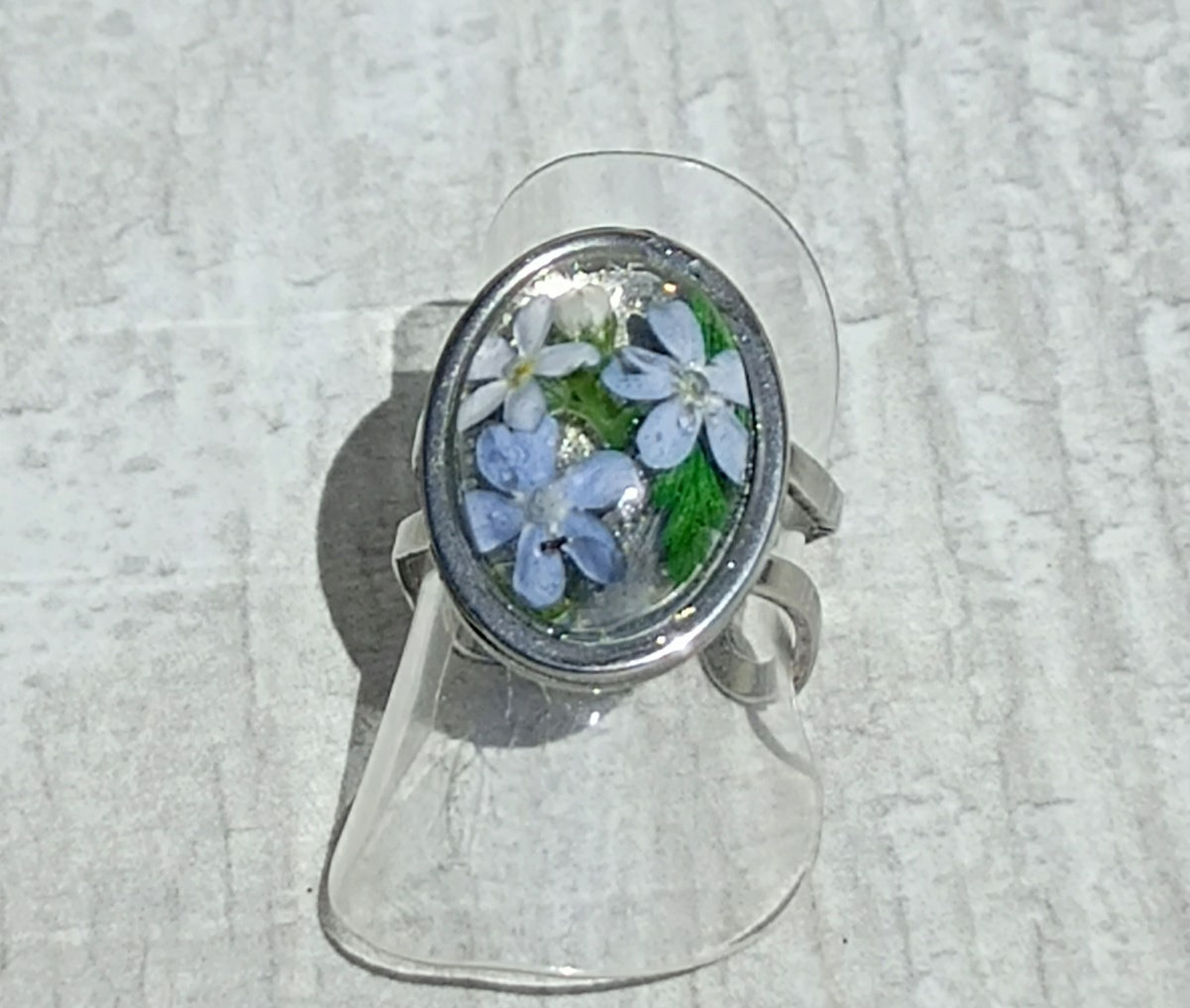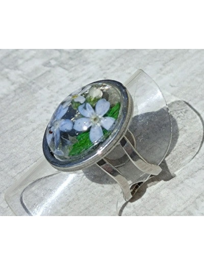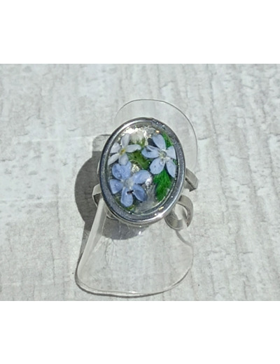 Bague résine ovale argenté fleur bleu #20