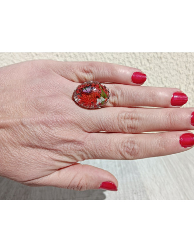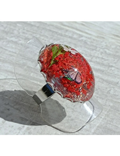 Bague réglable en acier inoxydable, résine et fleurs séchées.