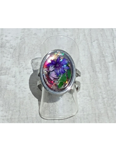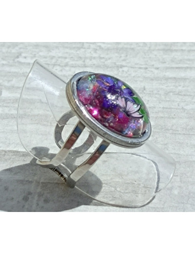 Bague réglable en acier inoxydable, résine et fleurs séchées.