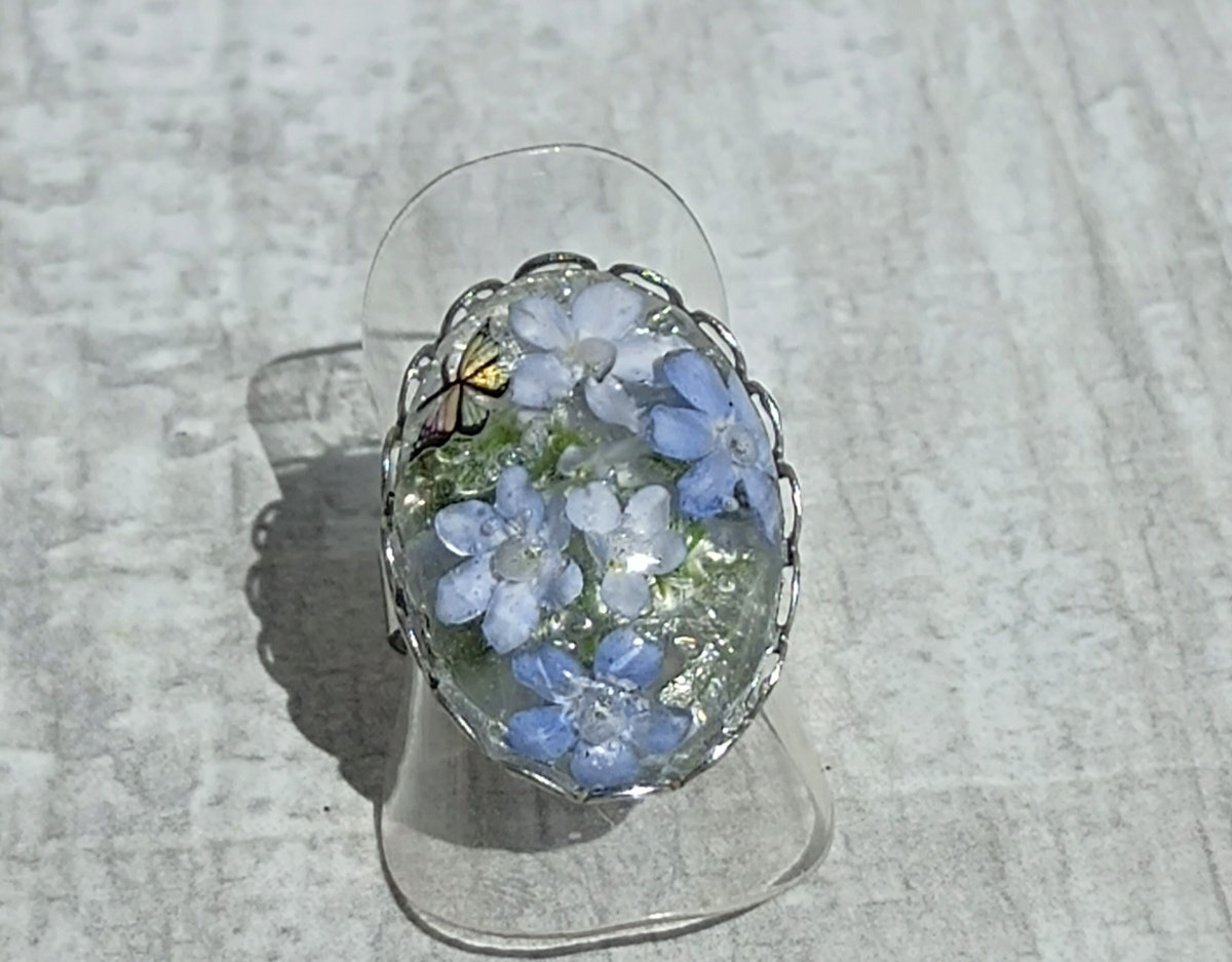 Bague réglable en acier inoxydable, résine et fleurs séchées.