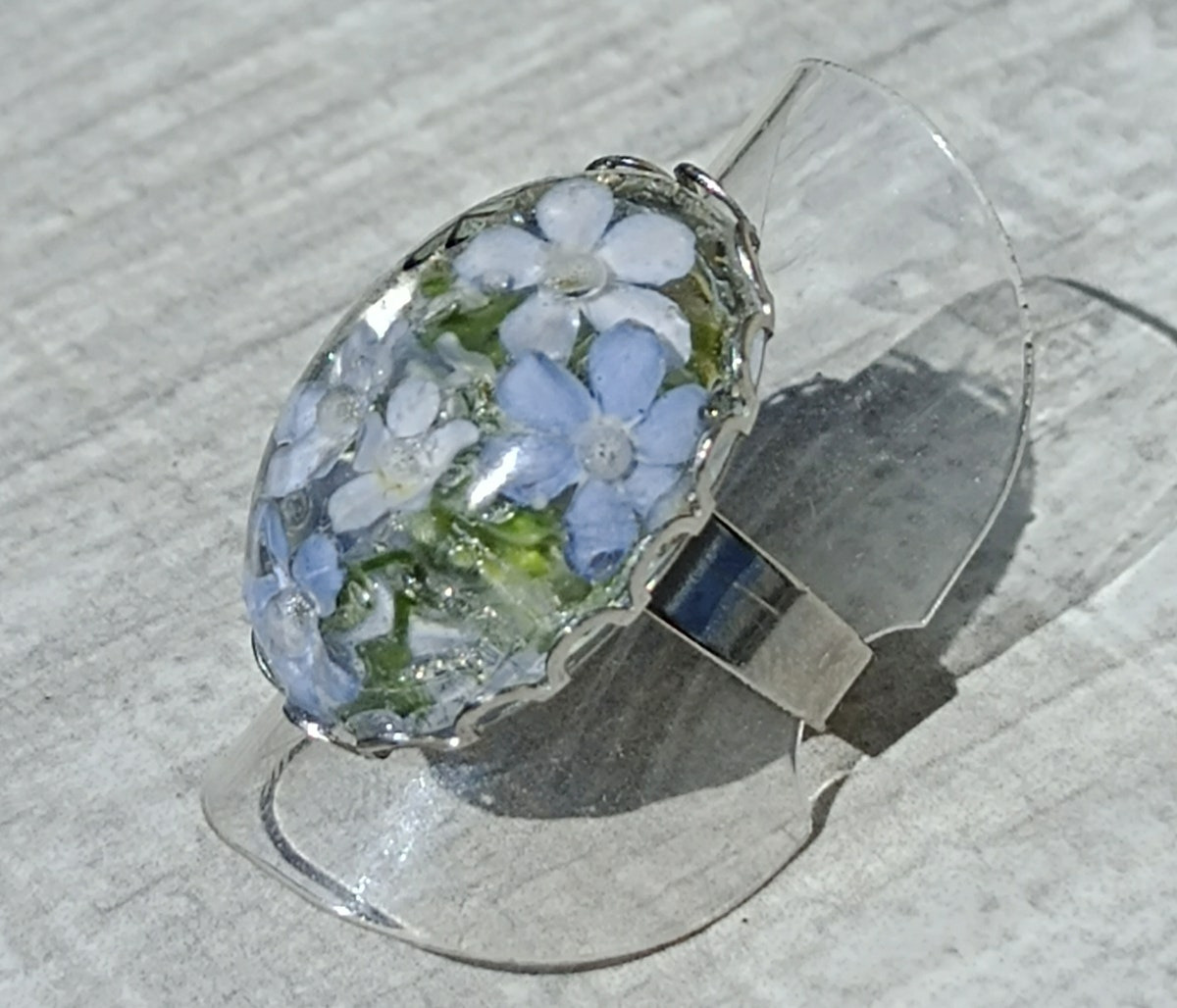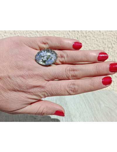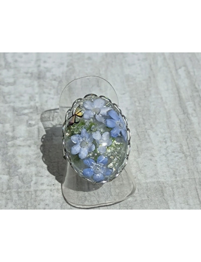 Bague résine ovale argenté fleurs bleu #13