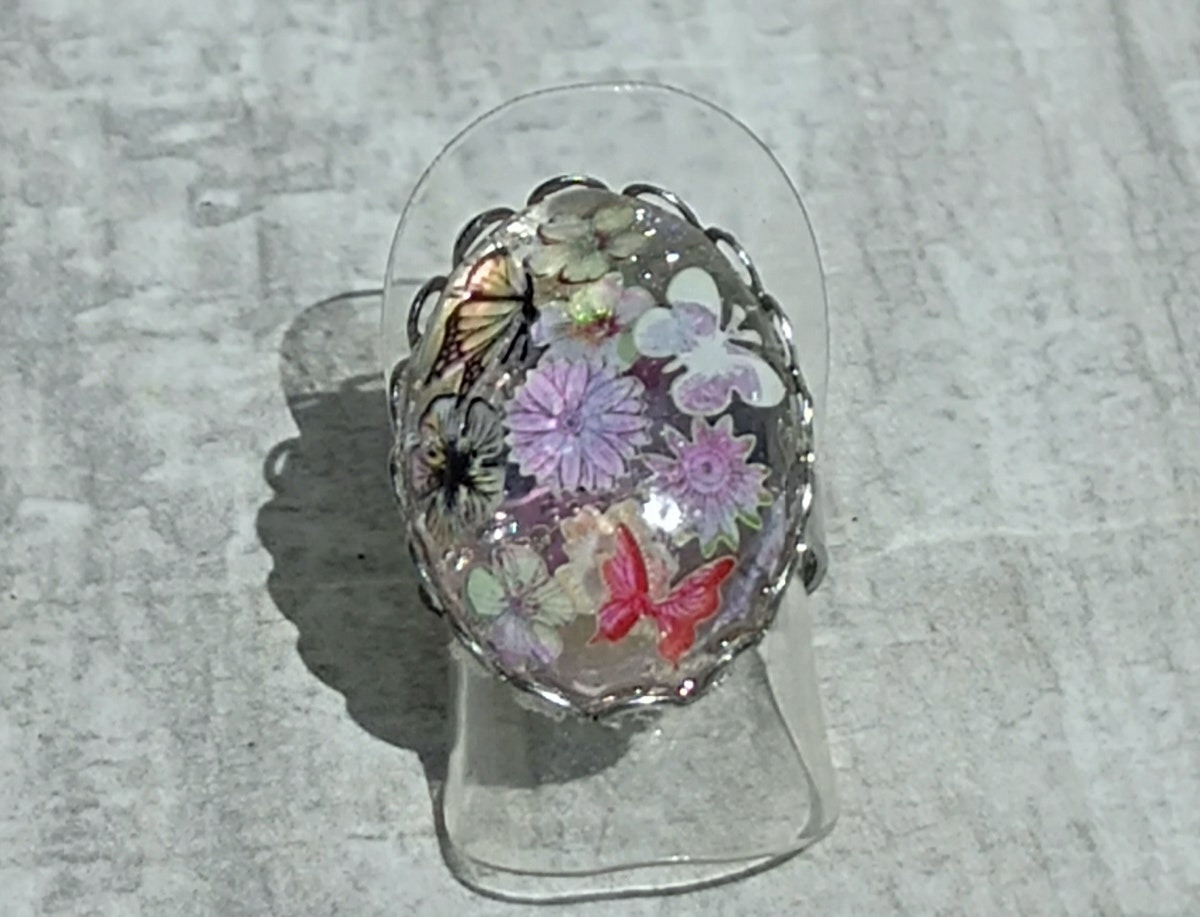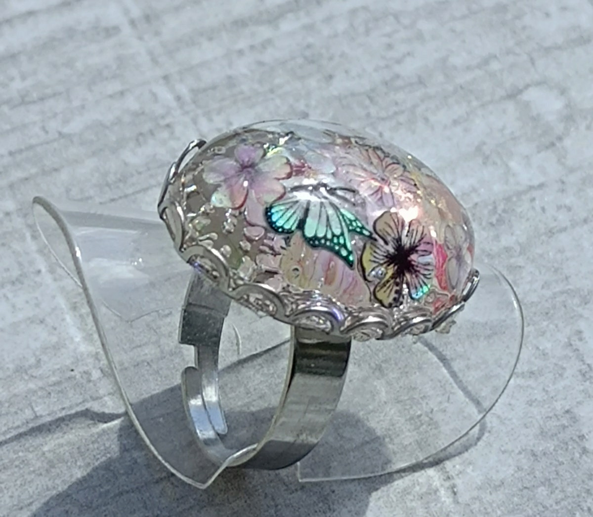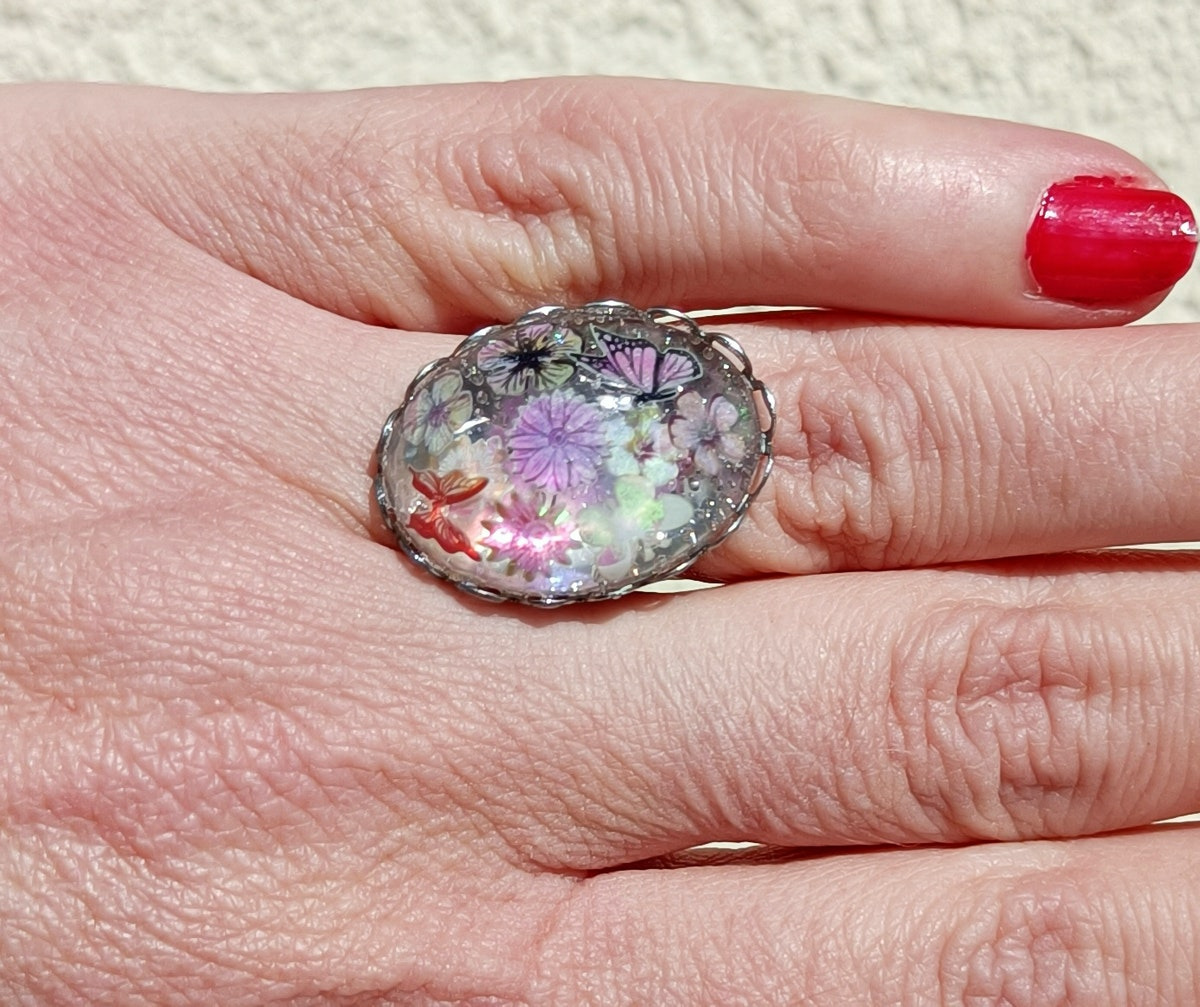 Bague réglable en acier inoxydable, résine et fleurs séchées.