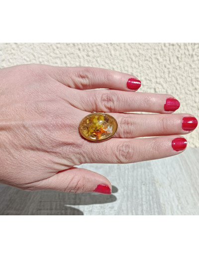 Bague résine ovale doré fleurs jaunes/orange #7
