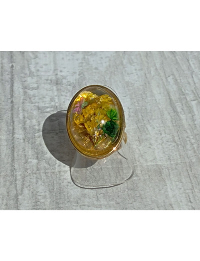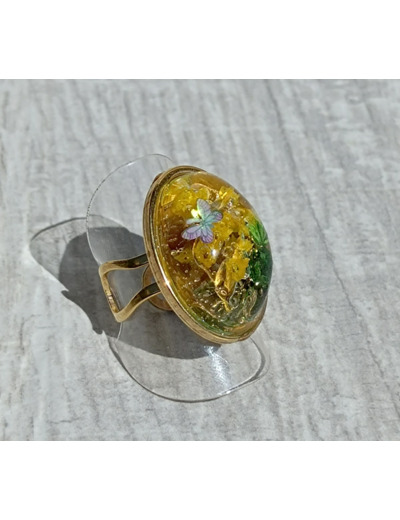 Bague réglable en acier inoxydable, résine et fleurs séchées.