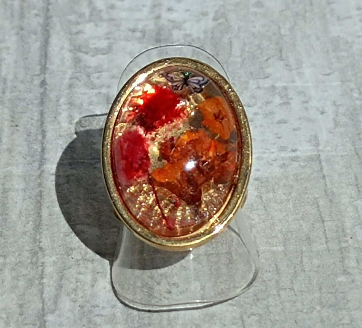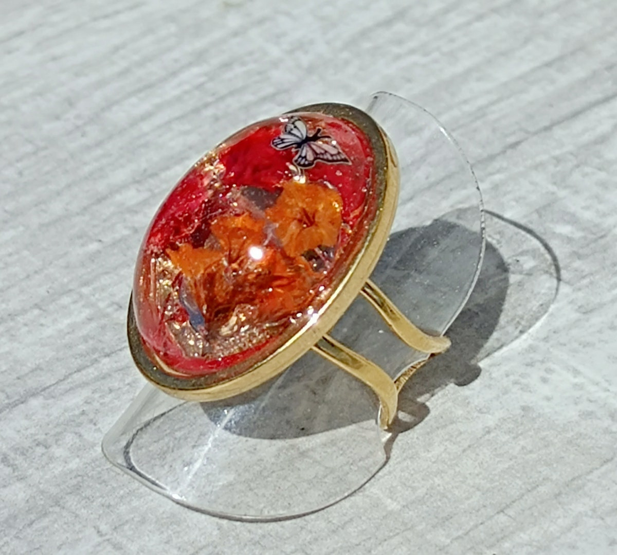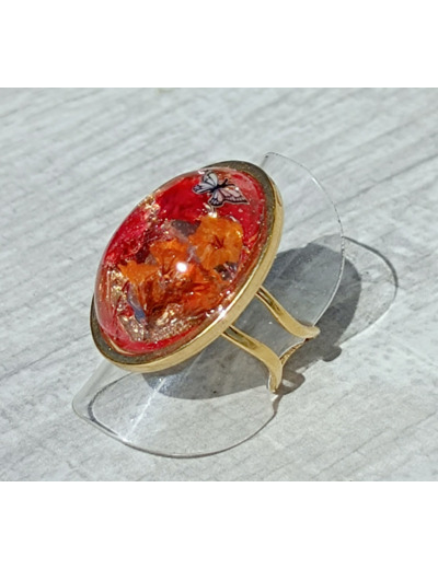 Bague réglable en acier inoxydable, résine et fleurs séchées.