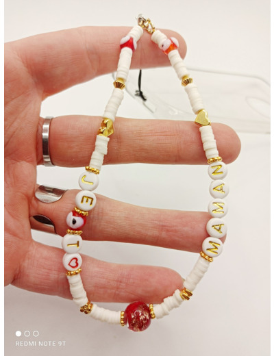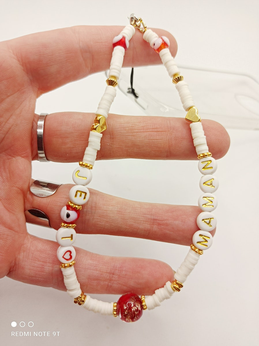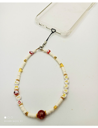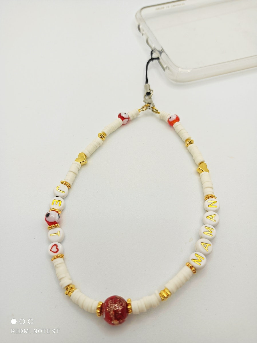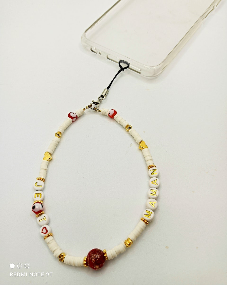 Ce modèle en perles Heishi, perles alphabet, perles dorées et perles de verre oeil porte-bonheur et grosse perle Murano rouge/or est léger, et donnera une touche personnalisée à votre smartphone.