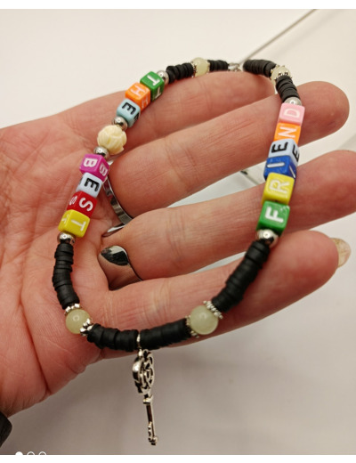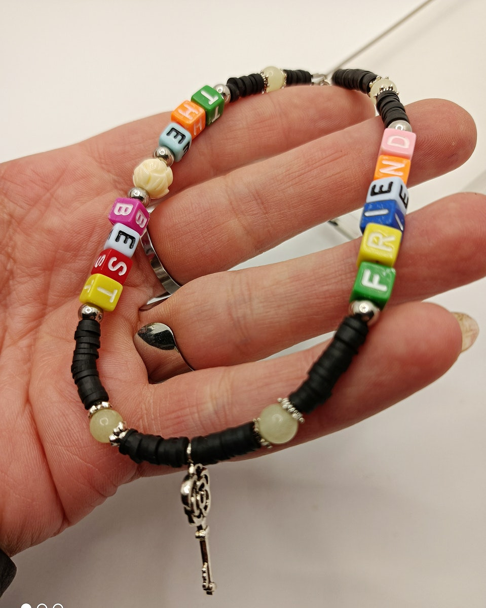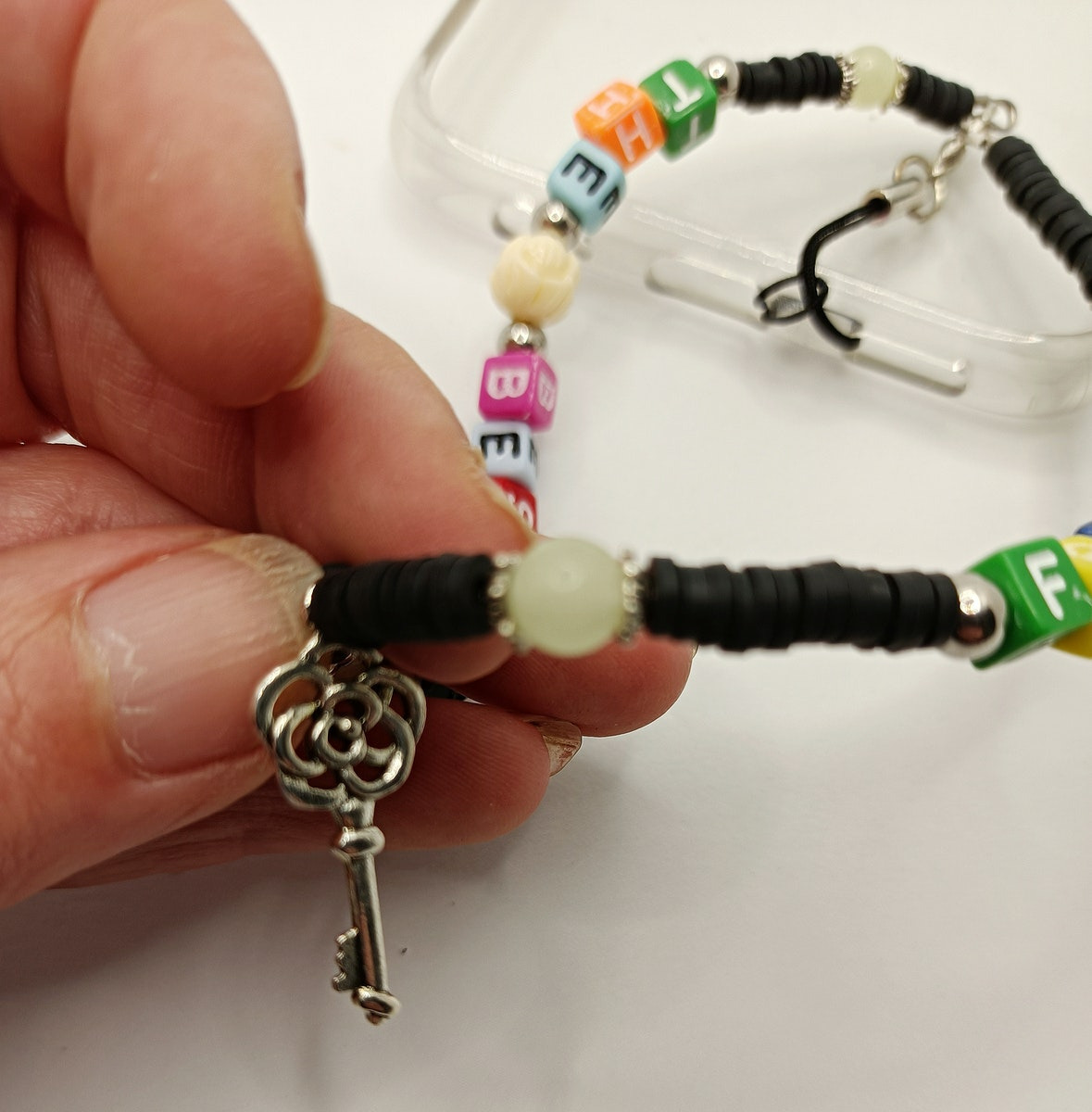 Ce modèle en perles Heishi, perles alphabet, perles phosphorescentes, argenté est léger, et donnera une touche personnalisée à votre smartphone.