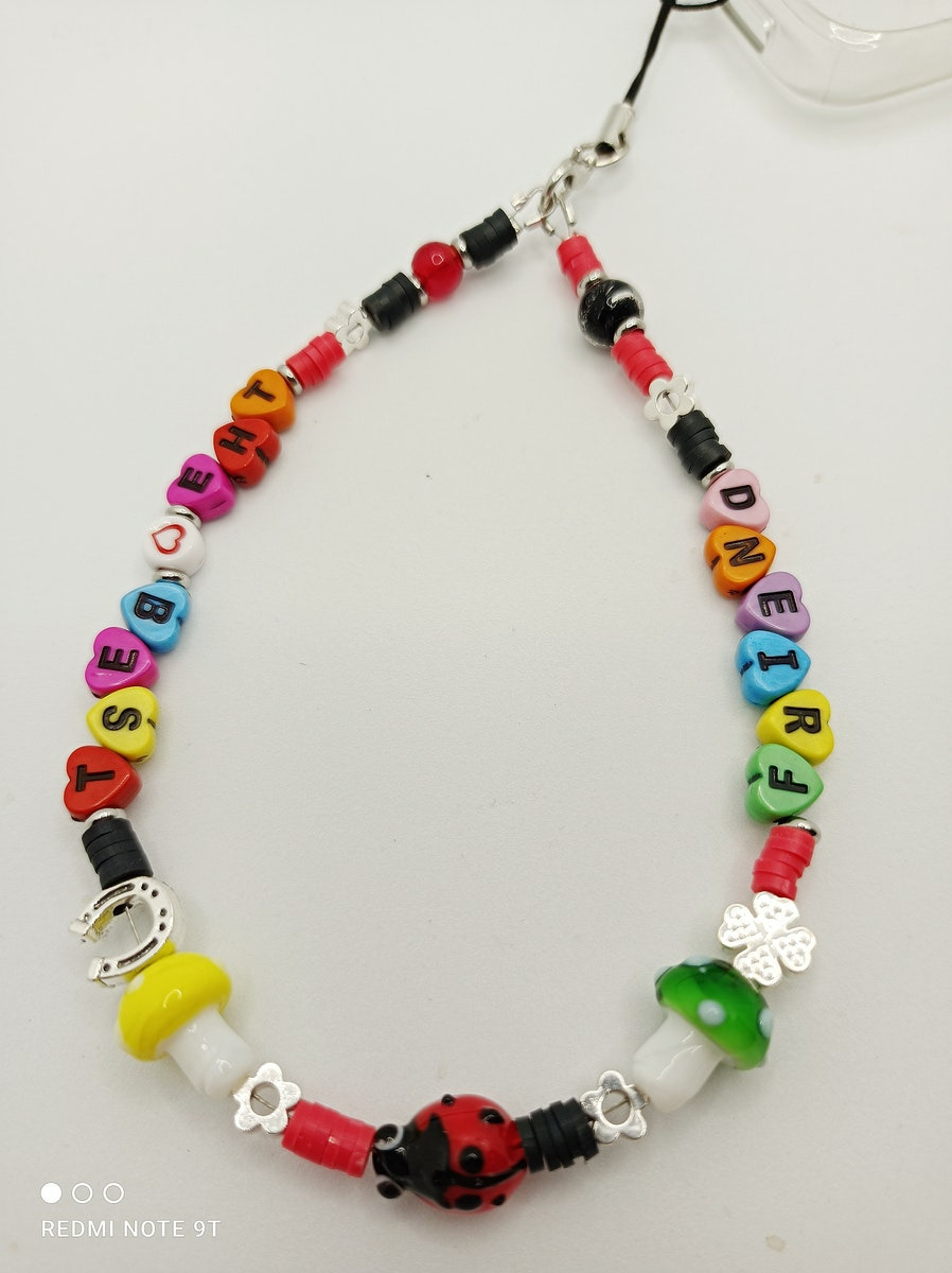 Ce modèle en perles Heishi, perles alphabet, perles dorées et perles Murano, donnera une touche personnalisée à votre smartphone.