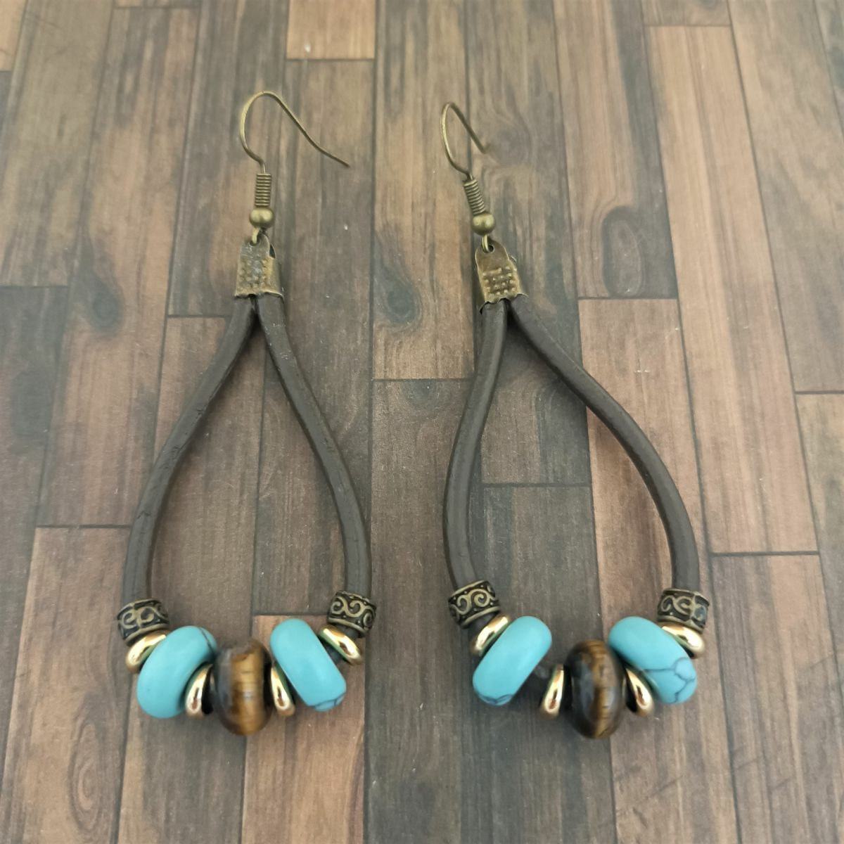 Perles turquoise et oeil de tigre, acier inoxydable doré, et bronze.