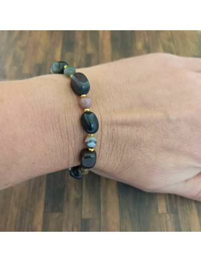 Bracelet en perles naturelles monté sur fil de cable et apprêts en acier inoxydable doré.