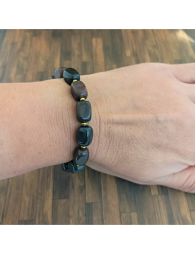 Bracelet en perles naturelles monté sur fil de cable et apprêts en acier inoxydable doré.