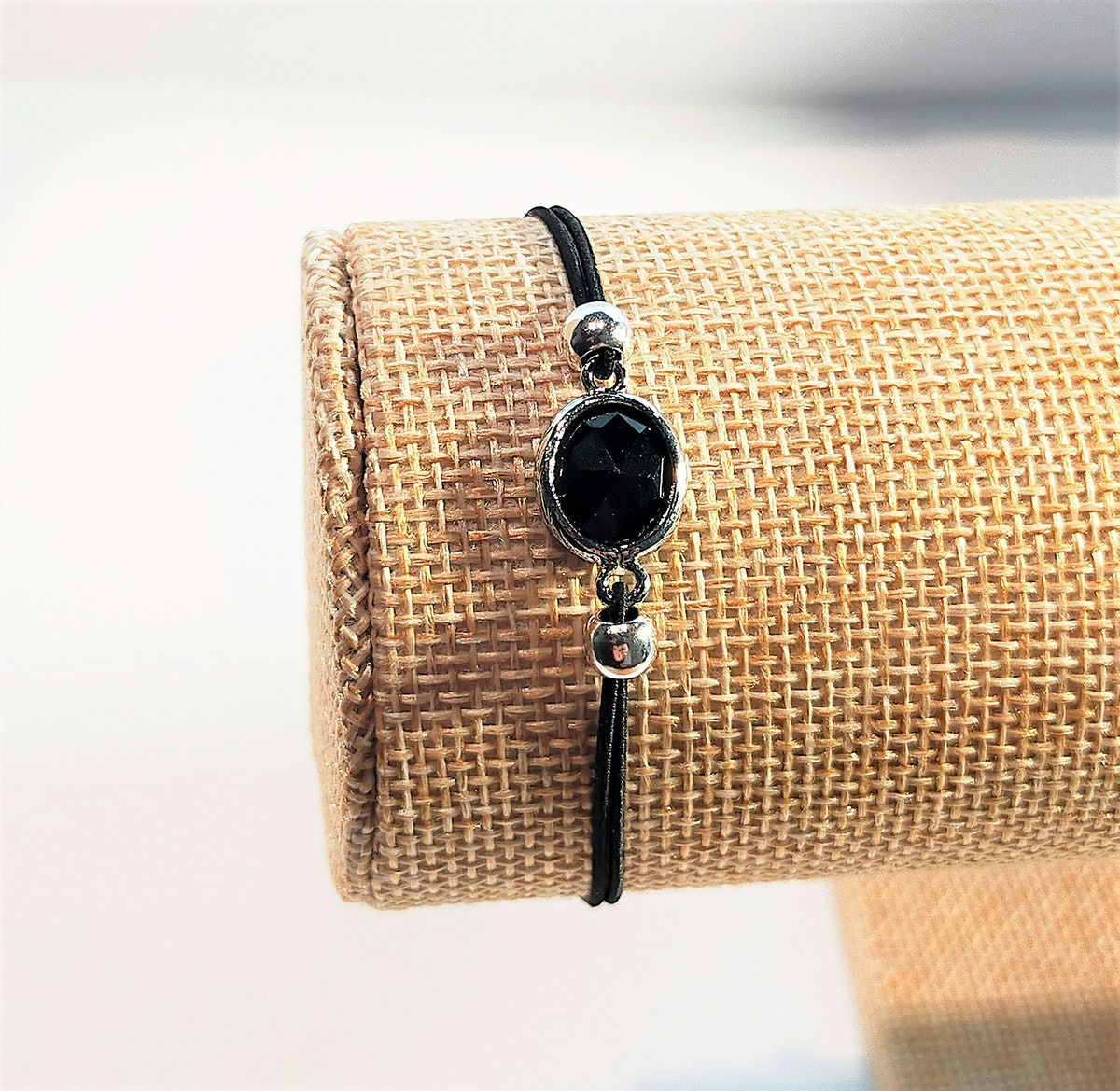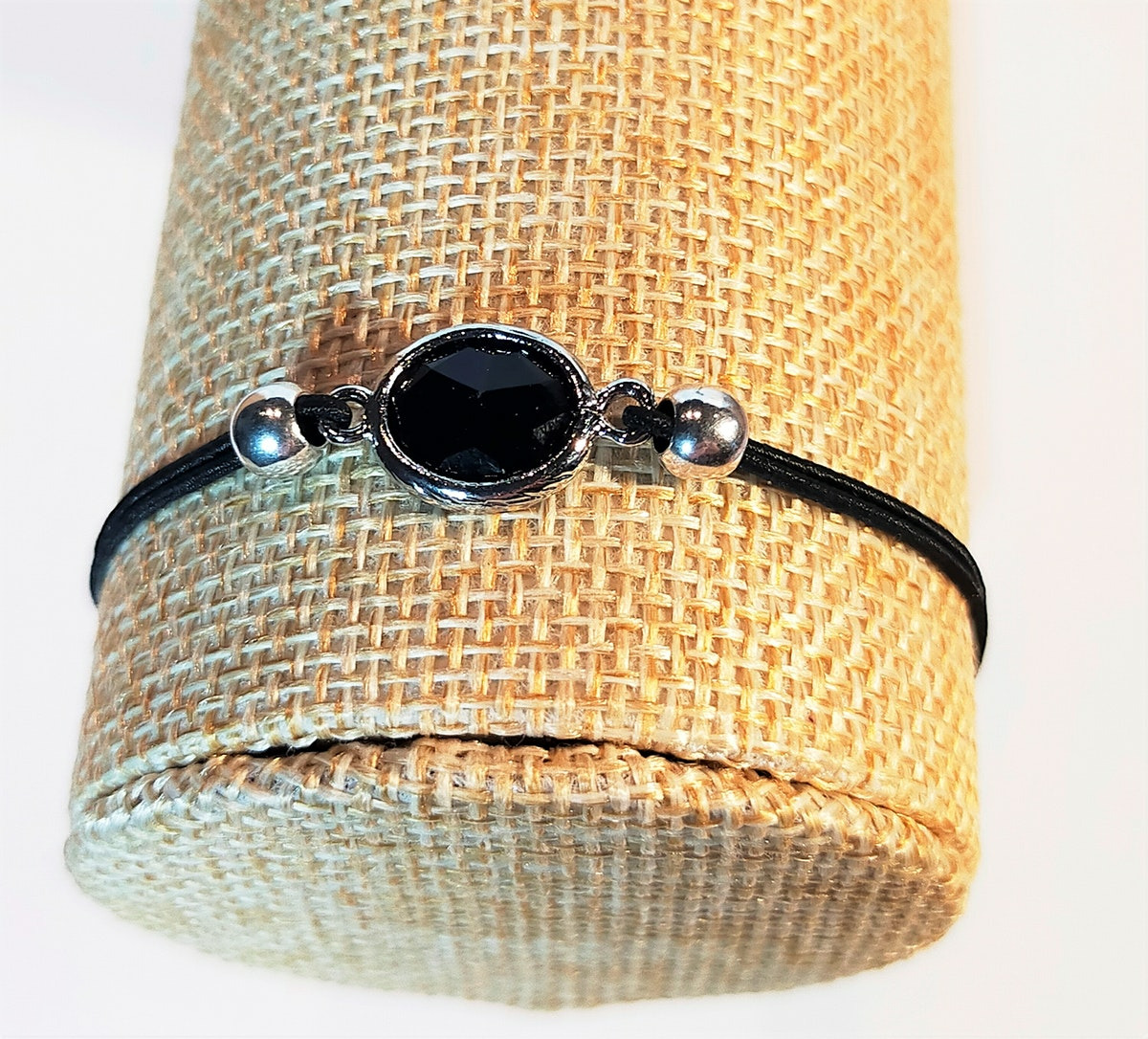 Ce modèle au design indémodable et agréable à porter, allie un cordon noir élastique de 0.8mm et un connecteurs Crystal Glass ovale 10x9mm noir opaque-argenté.