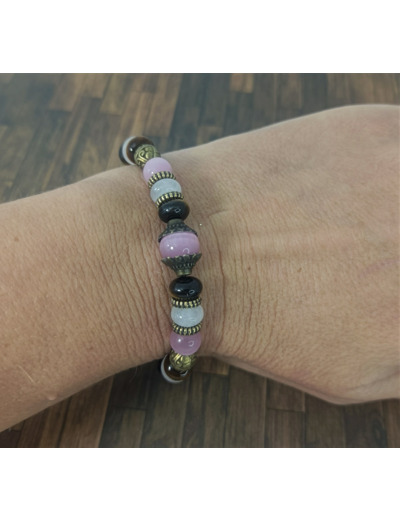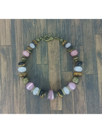 Craquez pour ce magnifique bracelet en perles naturelles (oeil de chat, quartz rose, oeil de tigre) et bronze.